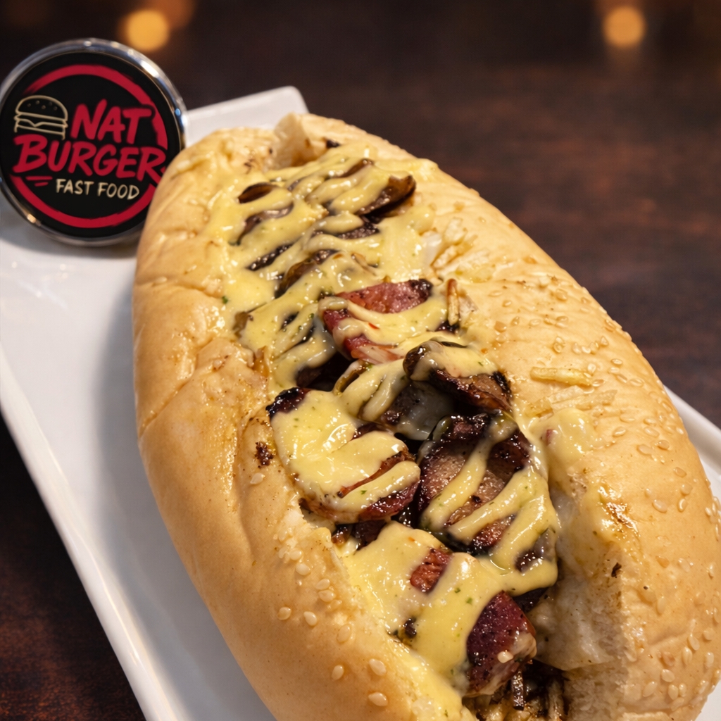 Pan finas hierbas, salchicha americana la plancha, lechuga, queso mozzarella gratinado, tocineta, papa chongo, salsa americana de la casa, salsa tártara.