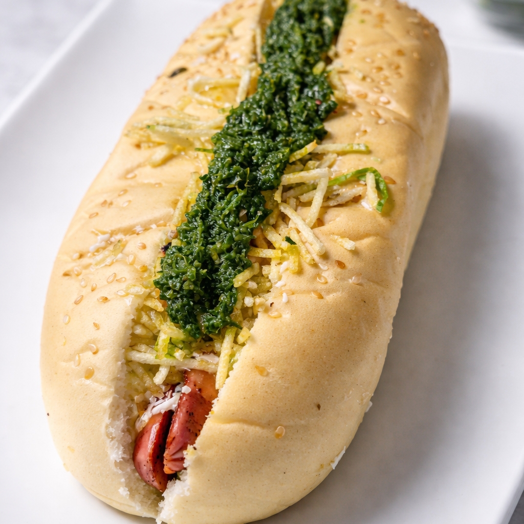 Pan de mantequilla, salchicha a la plancha en chimichurri, papa chongo, lechuga, queso, salsa tártara de la casa.