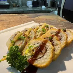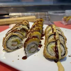 Rollo crocante relleno de salmón, queso crema, aguacate, bañado en salsa teriyaki.