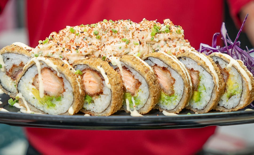 Roll crocante relleno de salmón, queso crema y aguacate con topping de aderezo de cangrejo y salsa teriyaki.