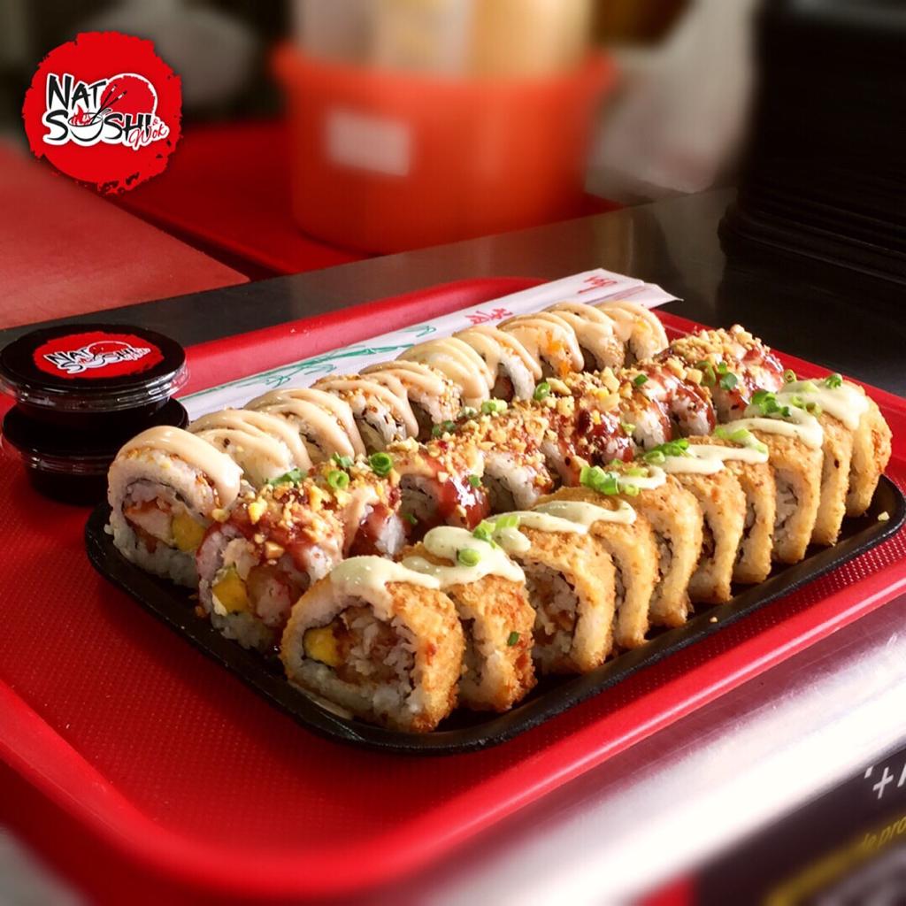 (5 piezas) Natsushi crunch, (5 piezas) vulcano, (5 piezas) alaska, (5 piezas) california crunch, bebida.