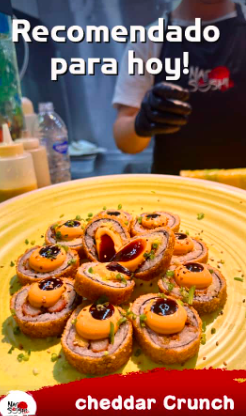 Roll crocante relleno de palmitos apanados, queso crema aguacate, bastones de maduro, cubierto en queso cheddar.