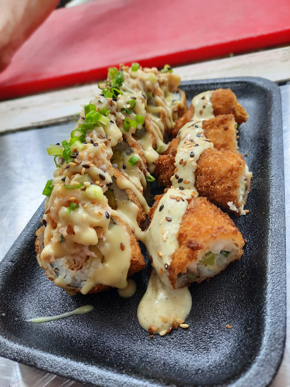 Relleno de palmitos crocantes, queso crema y aguacate cubierto en ajonjolí tostado, toping de camarones crocantes gratinados en salsa spicy y fuji y cebollín chino finamente picado.