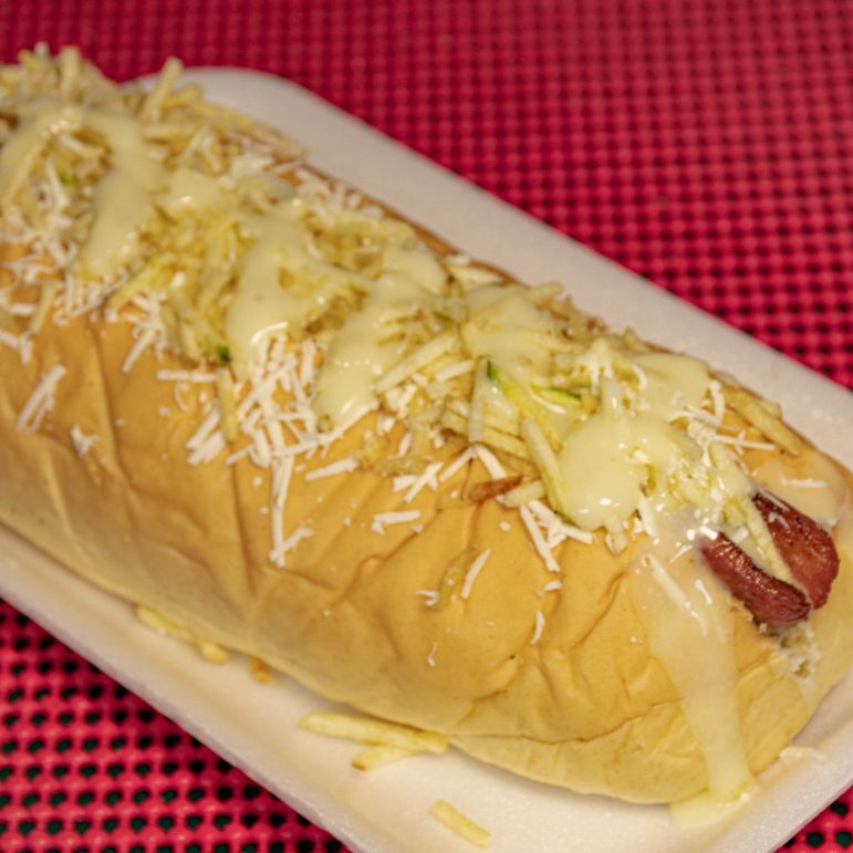 Trae: Pan de Mantequilla, Salchicha Premium, Tocineta, Mozarrella, Crema de Queso, Chongo, Lechuga, Salsas