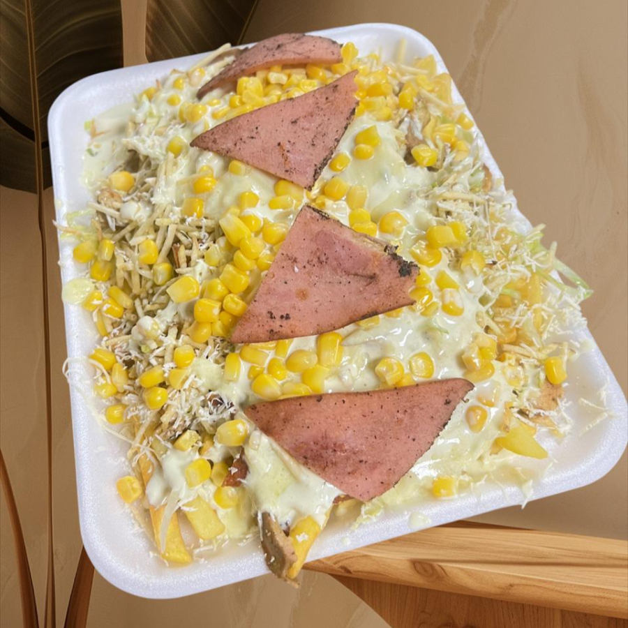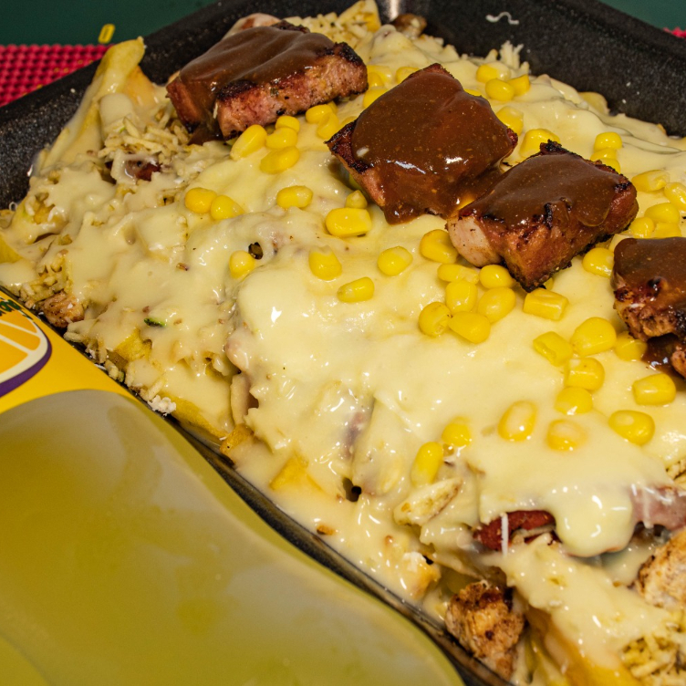 (Para (2) Personas ) Salchipapa acompañada de Pollo, chorizo, Butifarra, queso gratinado, maíz y salsas tártara y piña