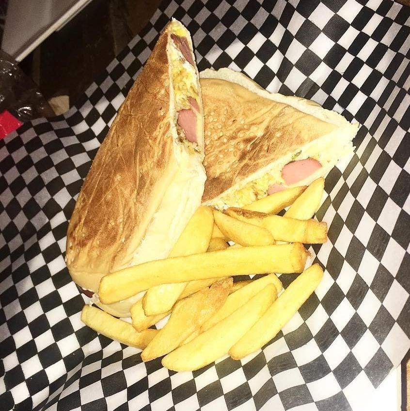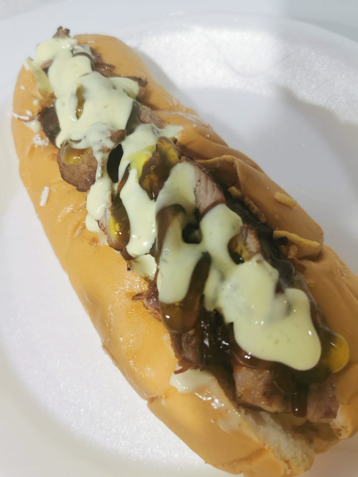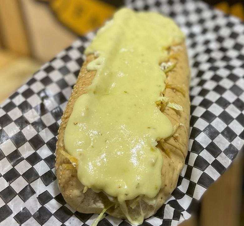 Pan de leche , salchicha, papa chongo, queso y salsa de la casa.