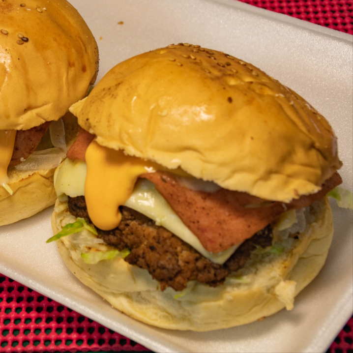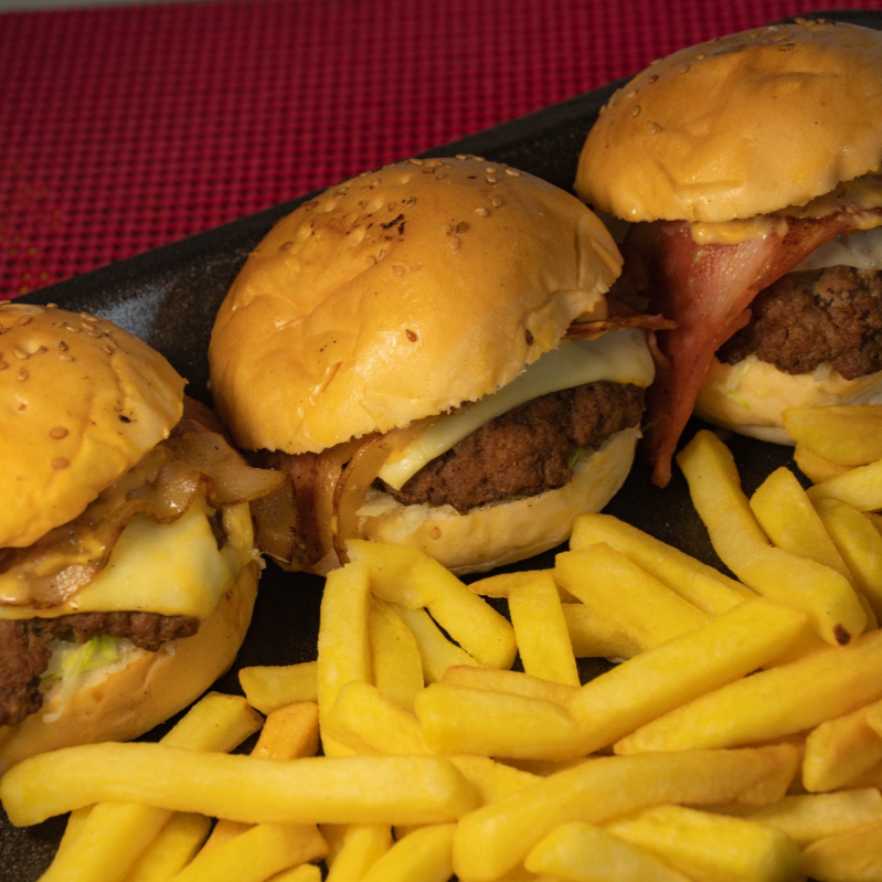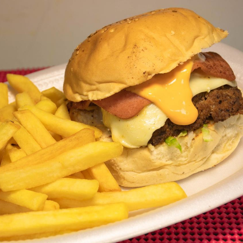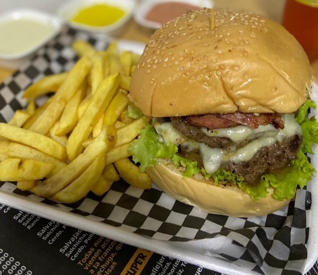 Trae: Carne Artesanal, Pan Artesanal, Mozzarrella, Jamon o Tocineta, Papas Fritas.