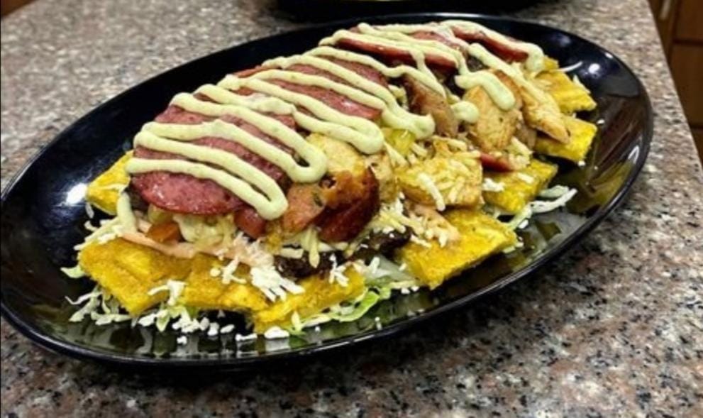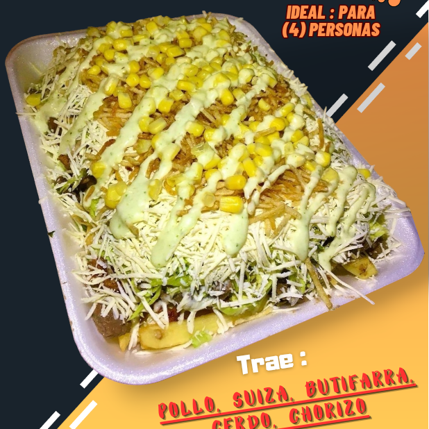 Papa fristas, salchicha, chorizo, butifarra, pollo queso costeño y salsa de la casa.