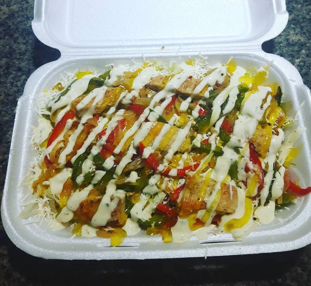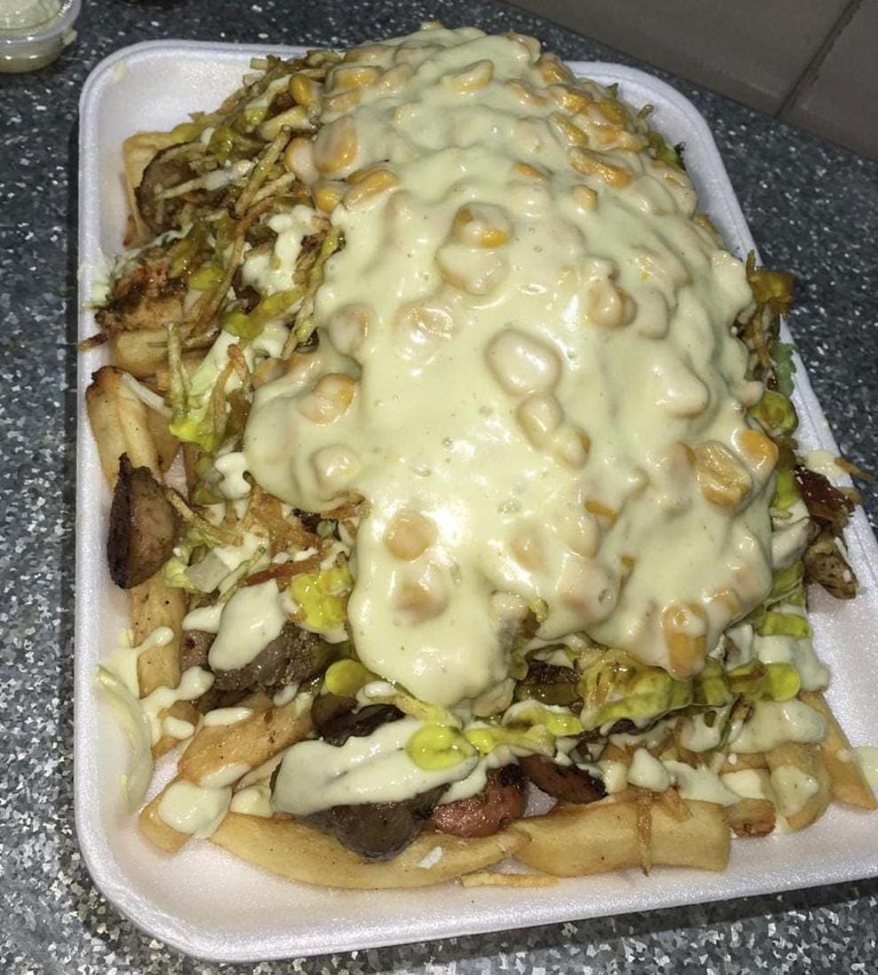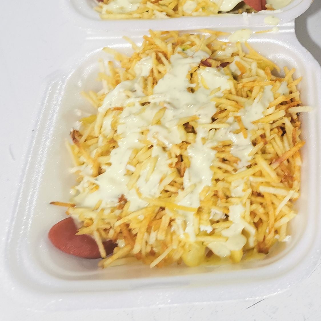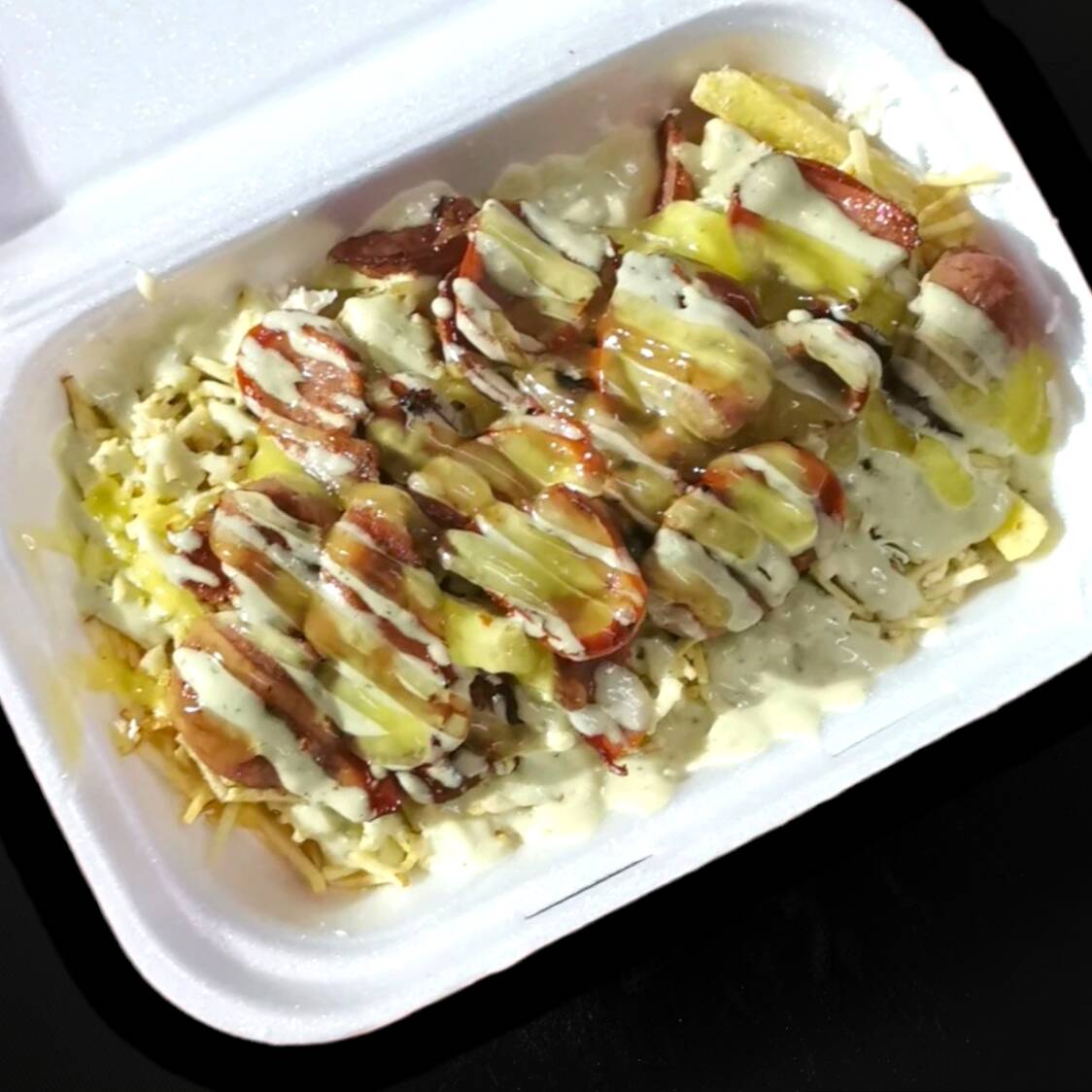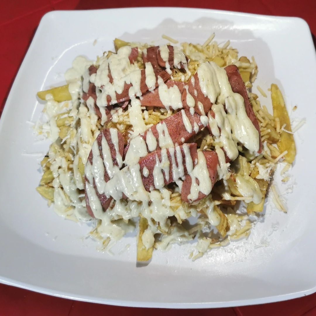 Papa fristas, salchicha, pollo trocitos, queso y salsa de la casa.