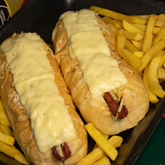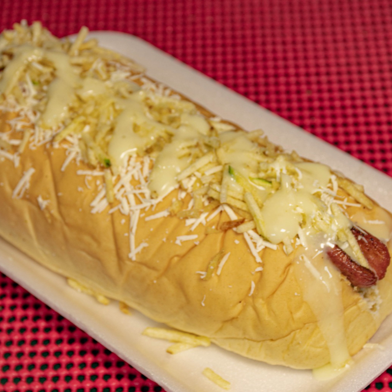 Trae: Pan, Papas Fritas, Mozzarrella, Salchicha, Queso Costeño, Salsas
