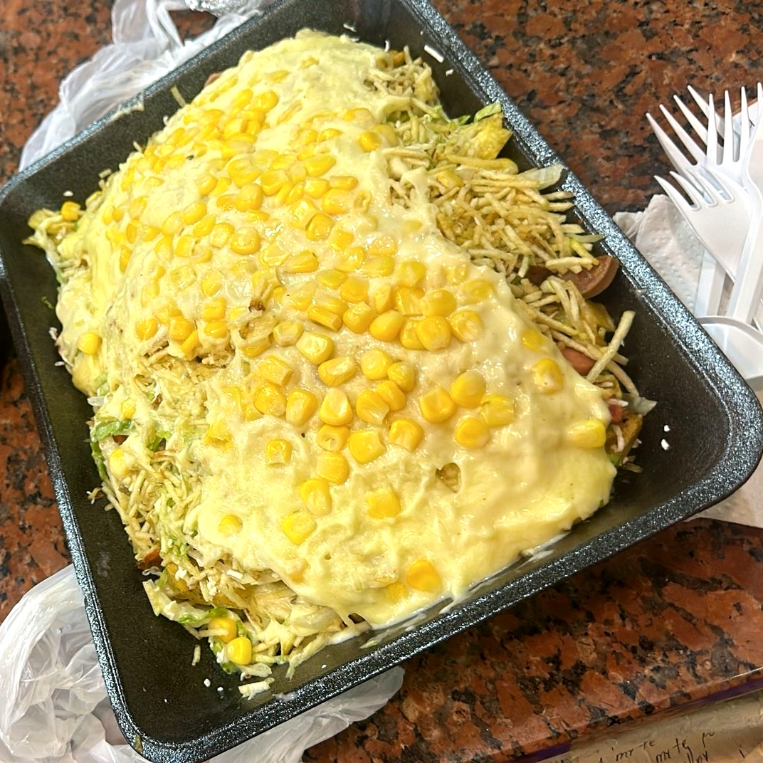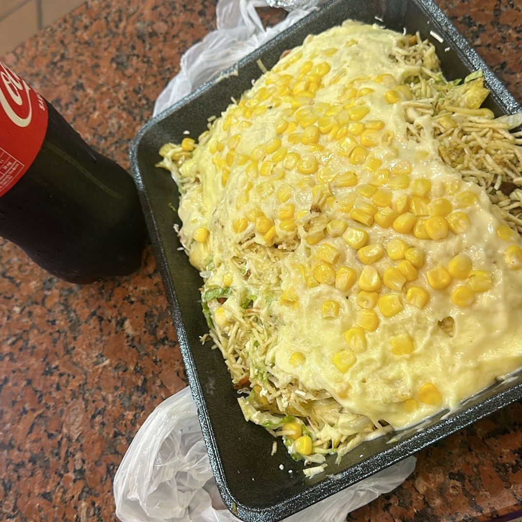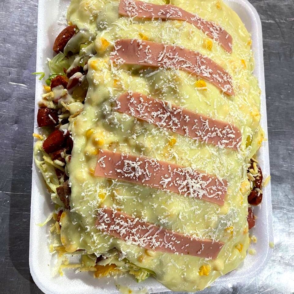 pollo en trocitos, chorizo y butifarra, queso mozzarella derretido, maiz , jamon y salsas de la casa.