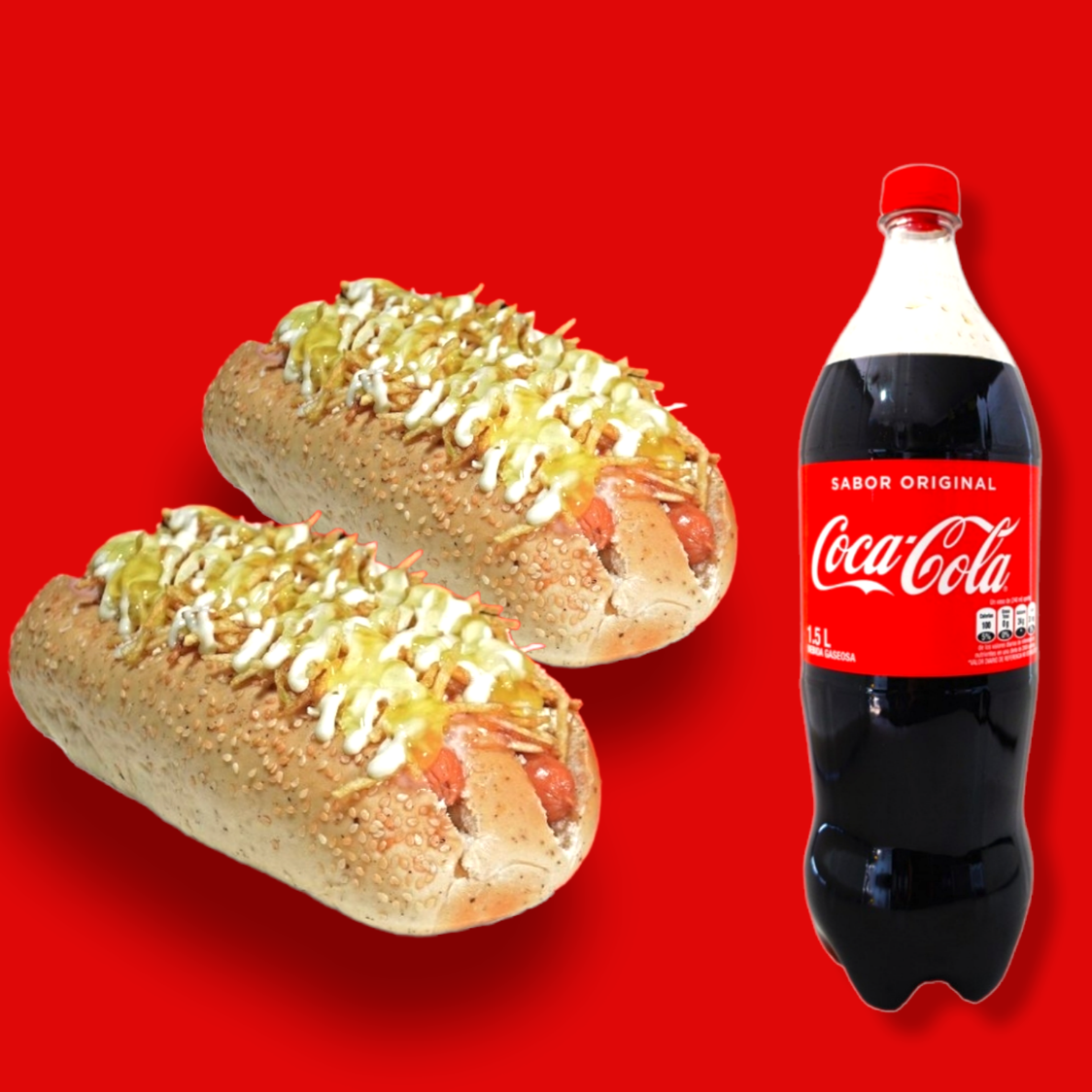 Doble Salchicha de pollo, Salsa Cheddar, acompañado de Gaseosa 1,5 lt