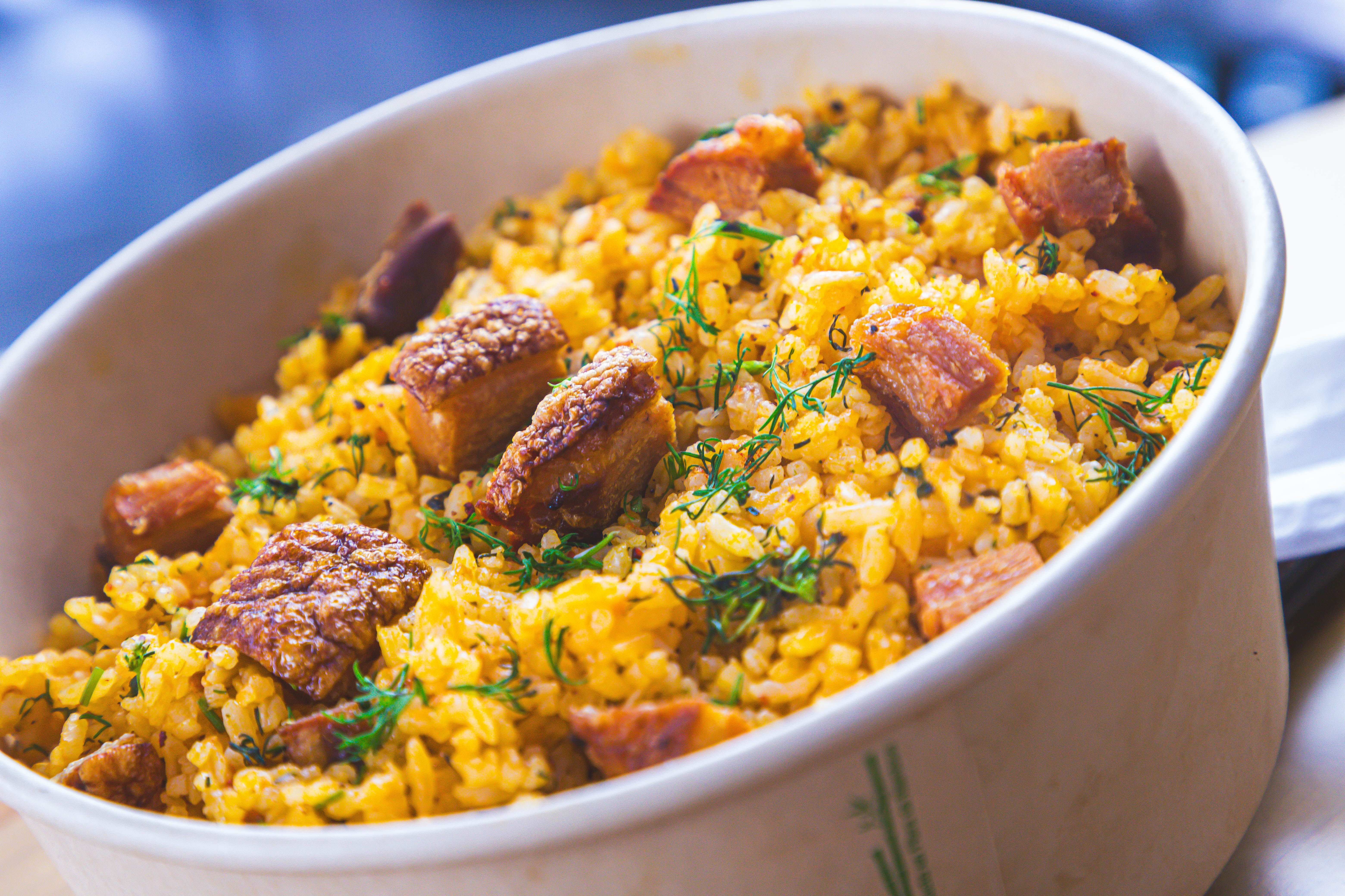 Arroz premium salteado en base de hogao con 24 horas de cocción gramos y chicharrón ahumado carnudo 200 gramos.
