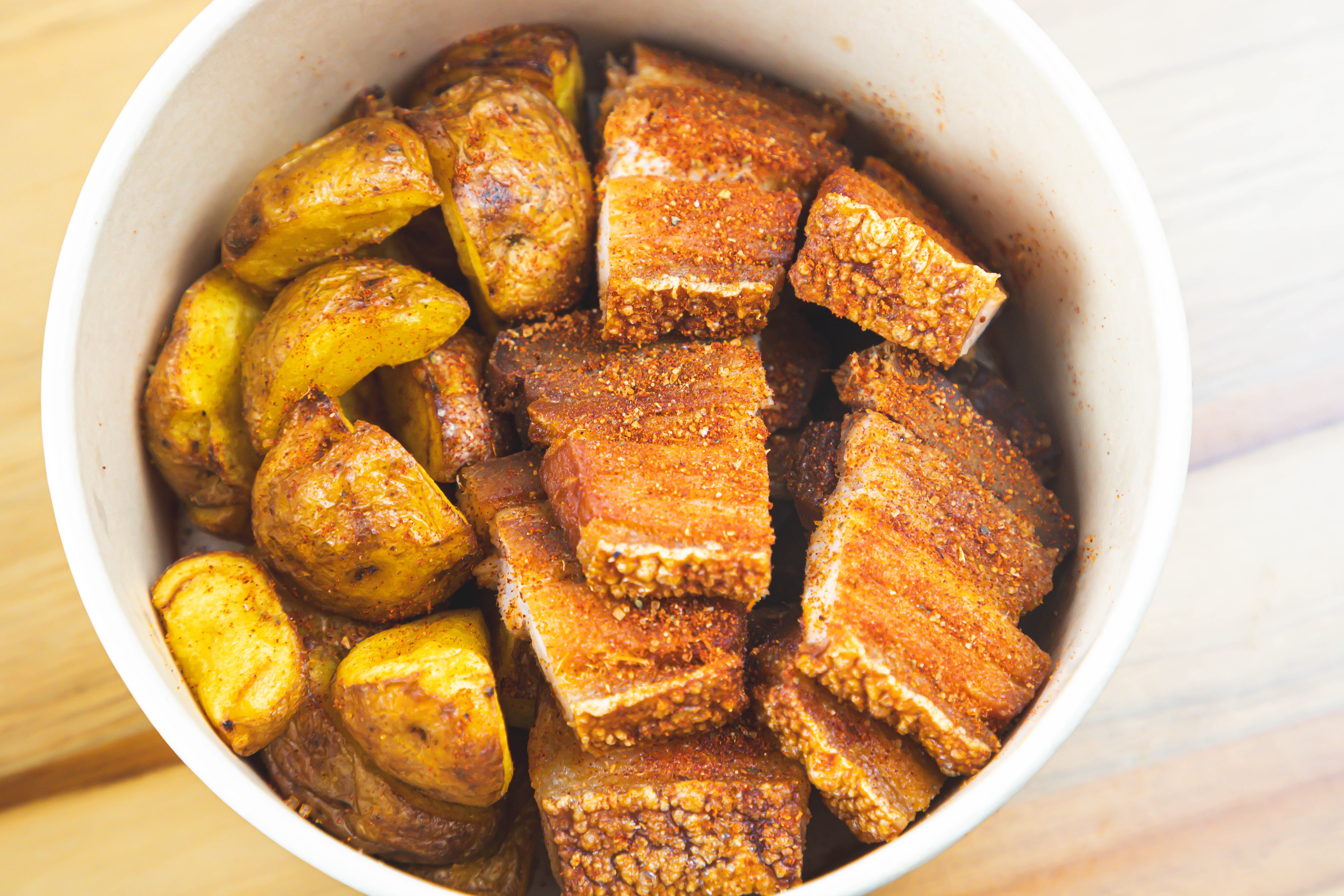 Tocino carnudo ahumado durante 12 horas 350 gramos, sazonado con una mezcla de especias rub, y acompañado de papa criolla crocante 200 gramos.
