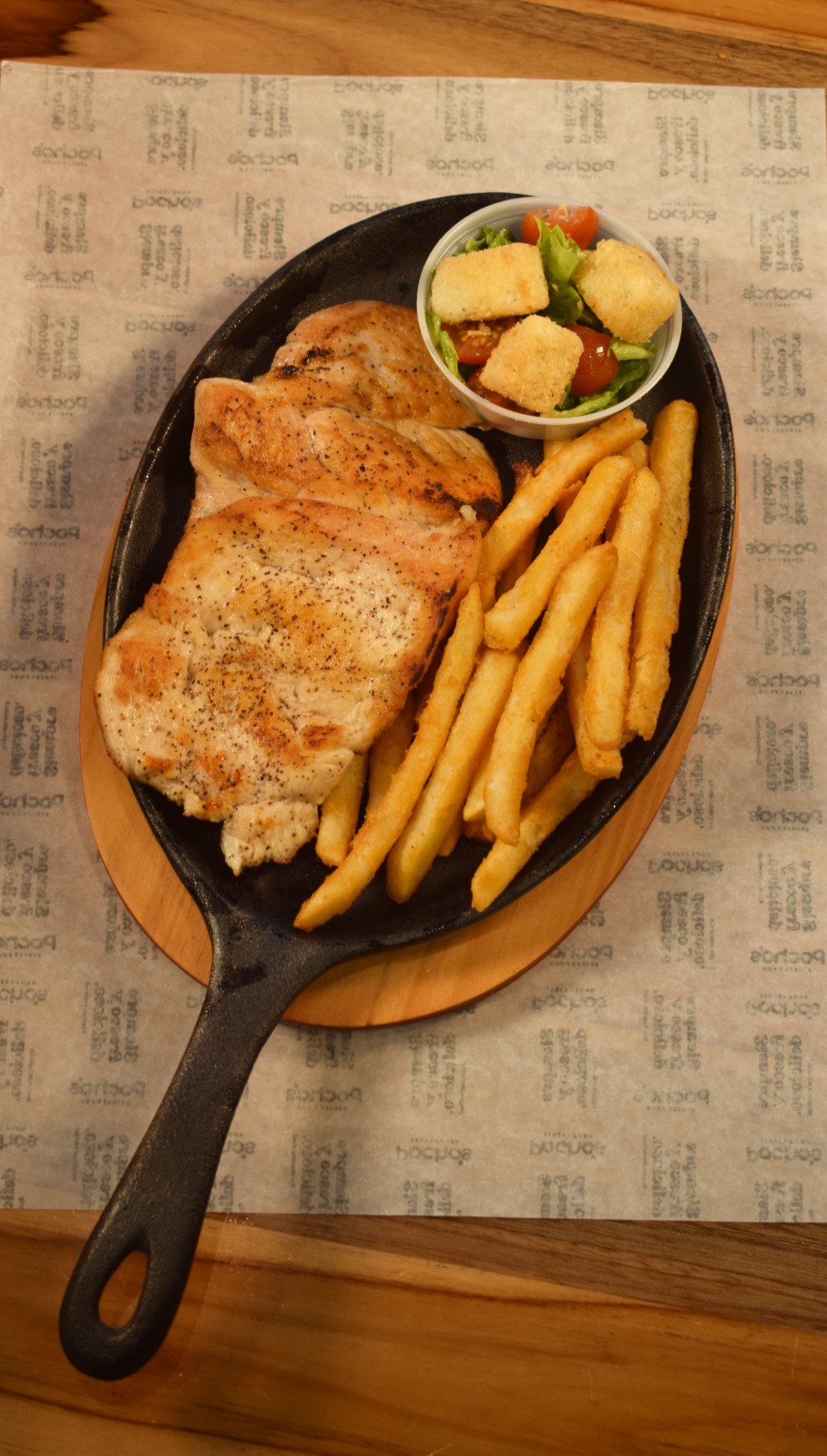 Pechuga de pollo (200 g) acompañado de papas a la francesa y ensalada fresca. Incluye Coca Cola Pet Original o Zero x 400 ml.