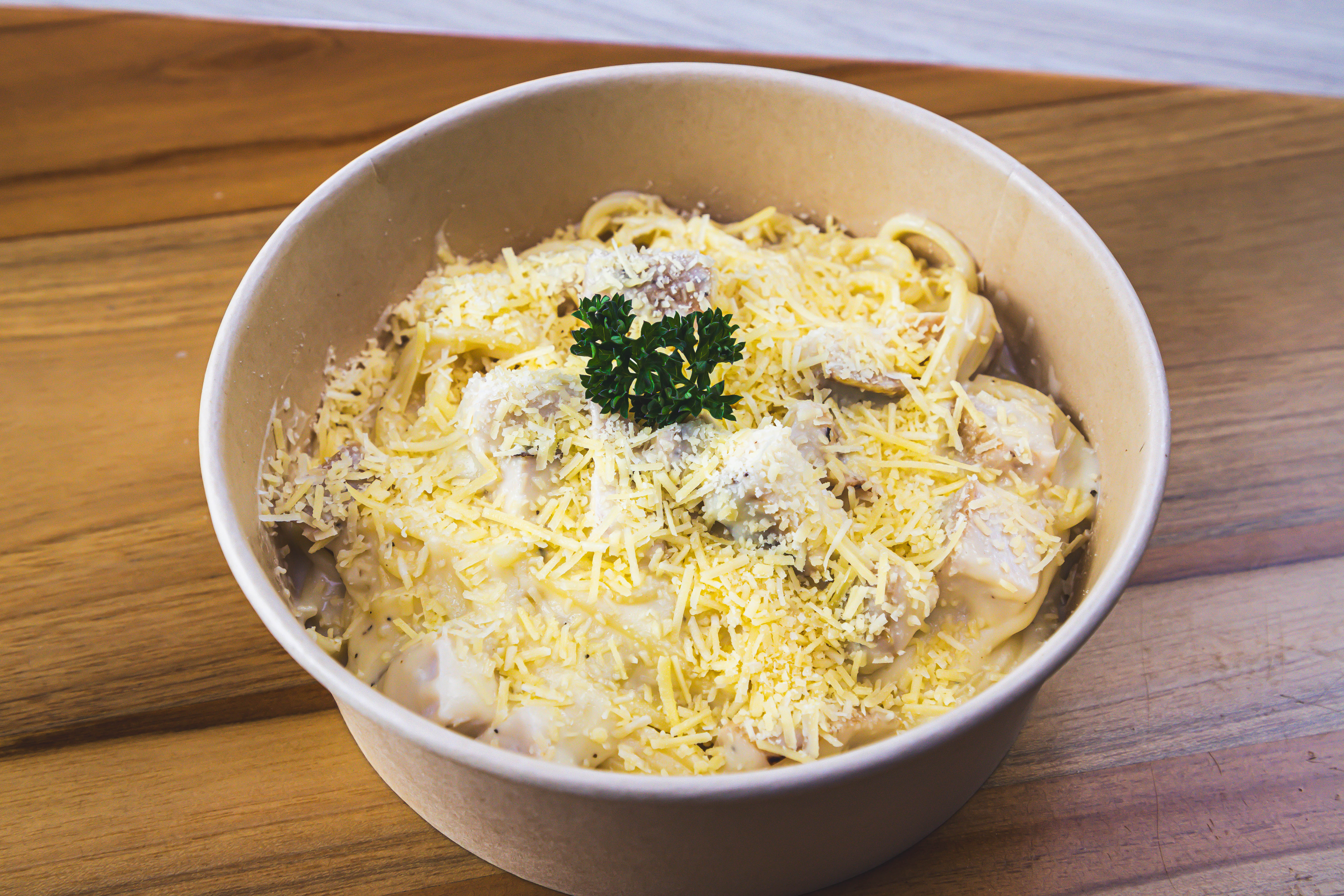 Fetuccini, linguine, penne 200 gramos, en salsa alfredo acompañado con queso parmesano y pan tostado.