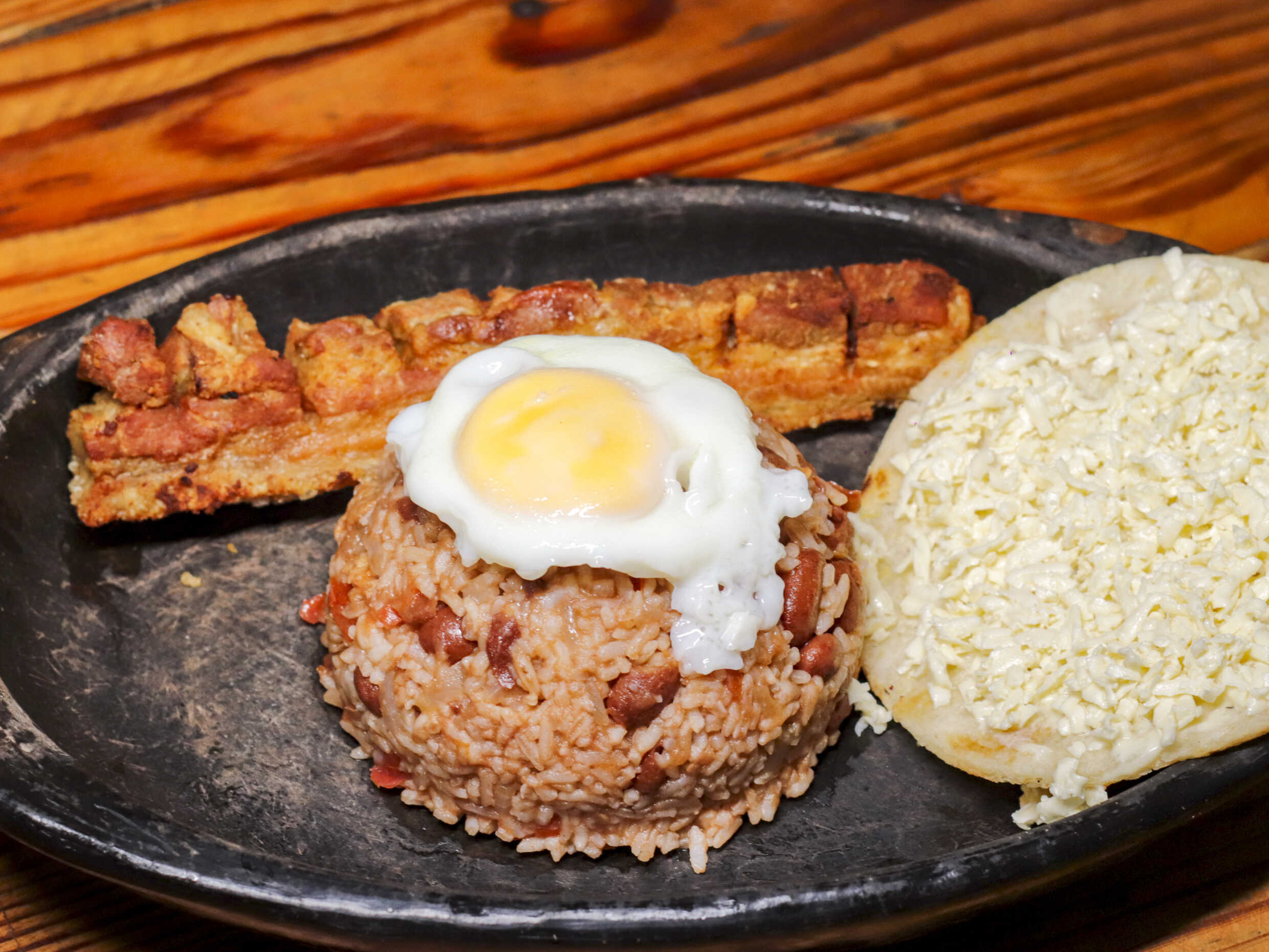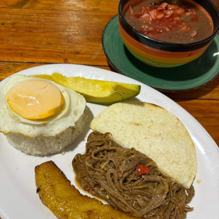 Chicharrón, huevo, arroz, frijol cargamanto, tajada de maduro, arepa tela con queso y aguacate.