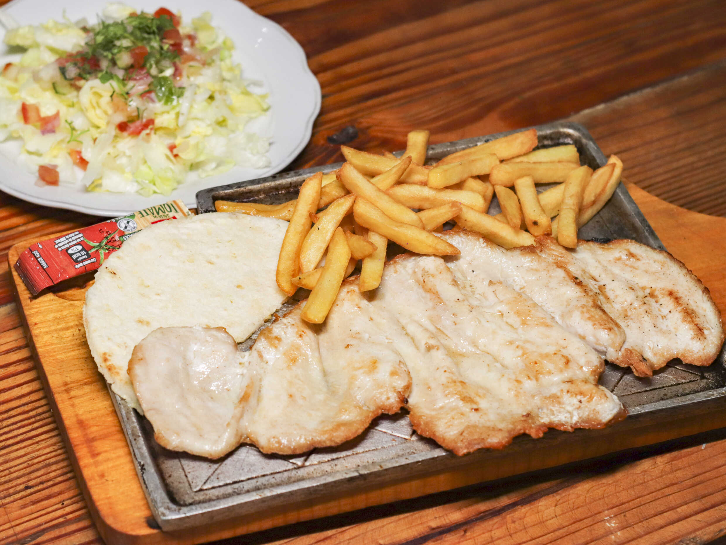 De 300 g, acompañado de papas a la francesa, ensalada (tomate, cebolla y lechuga).