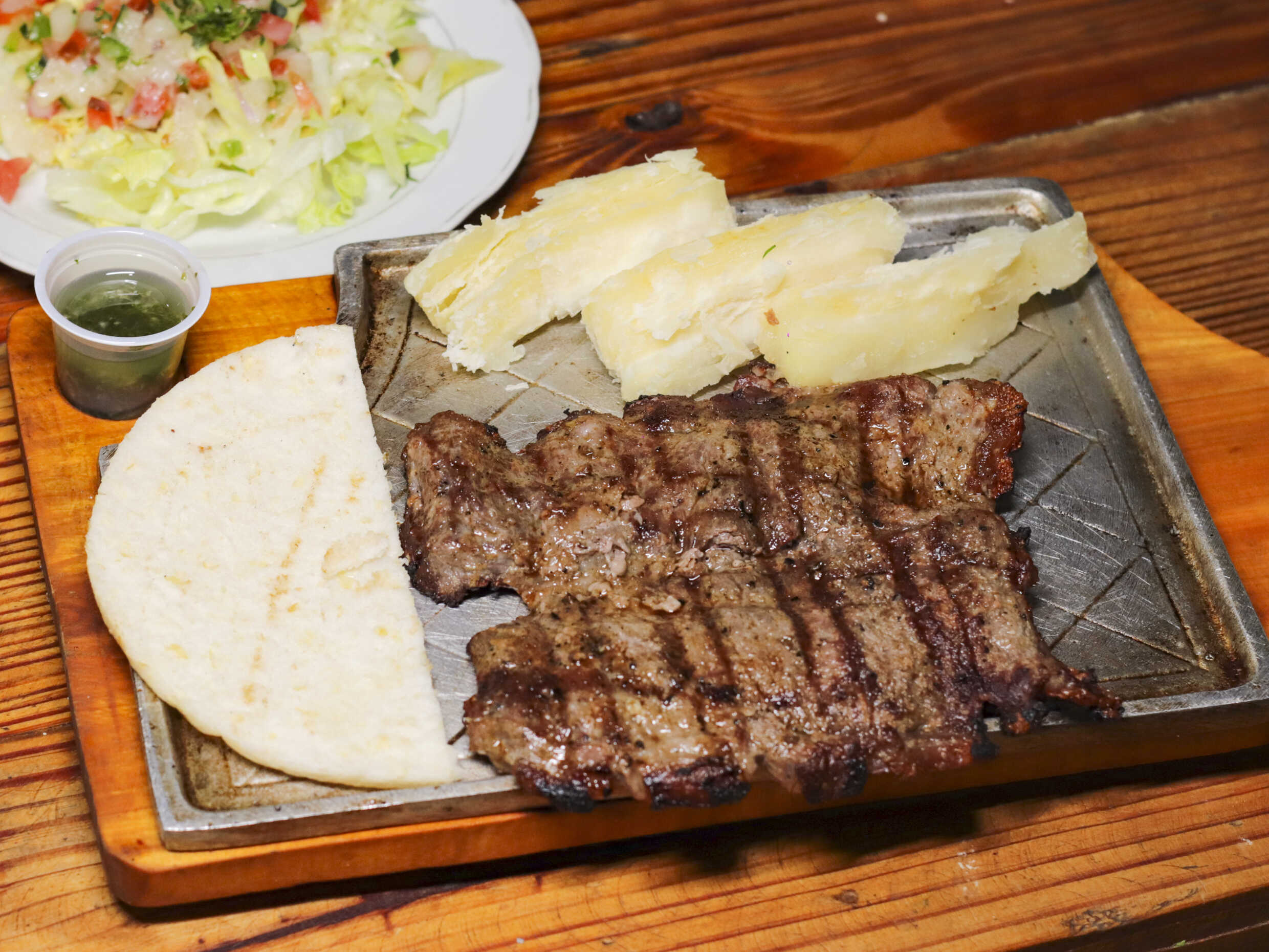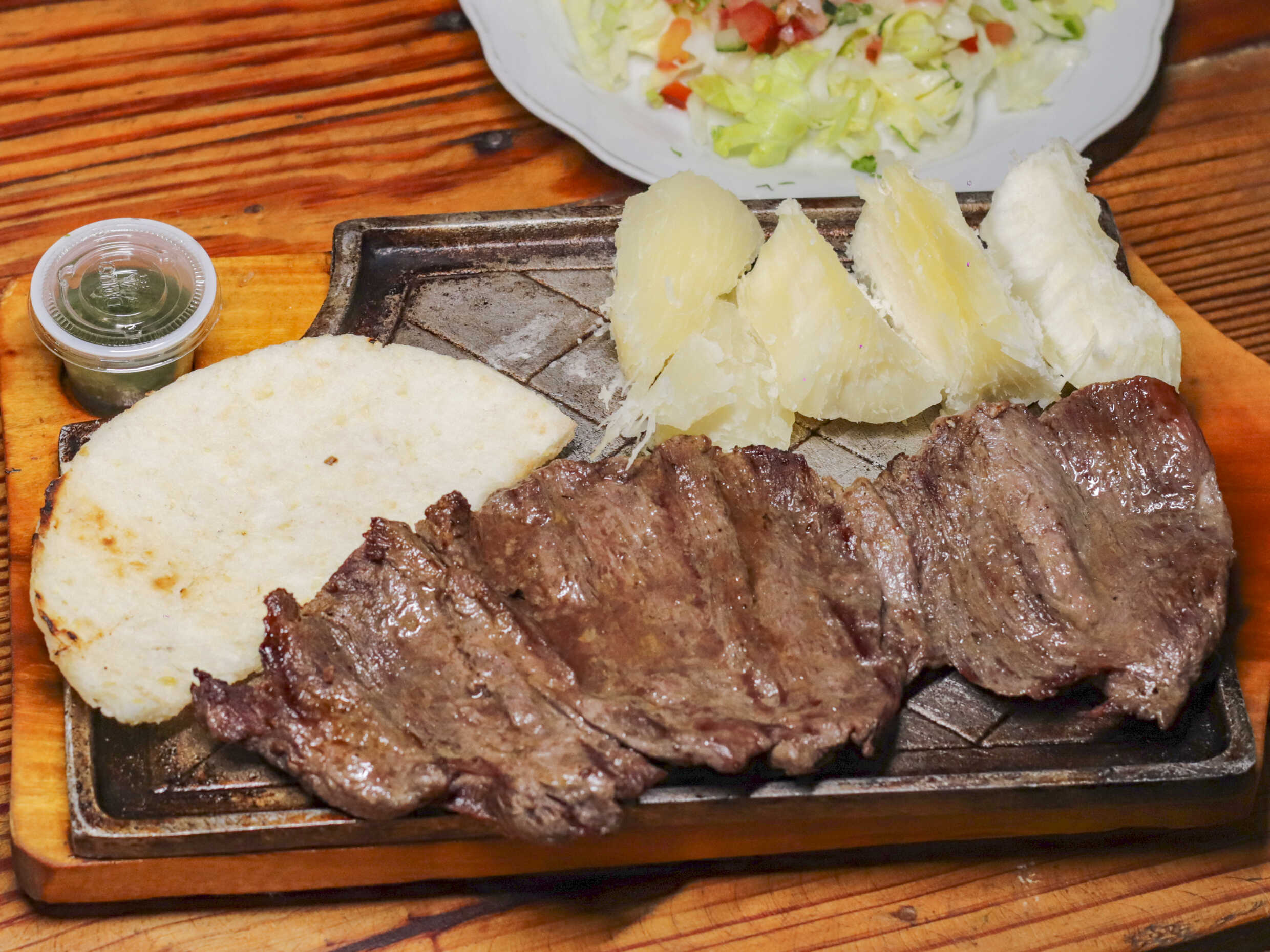 De 300 g, acompañado de papa cocida, arepa de tela, ensalada (tomate, cebolla y lechuga) y chimichurri.