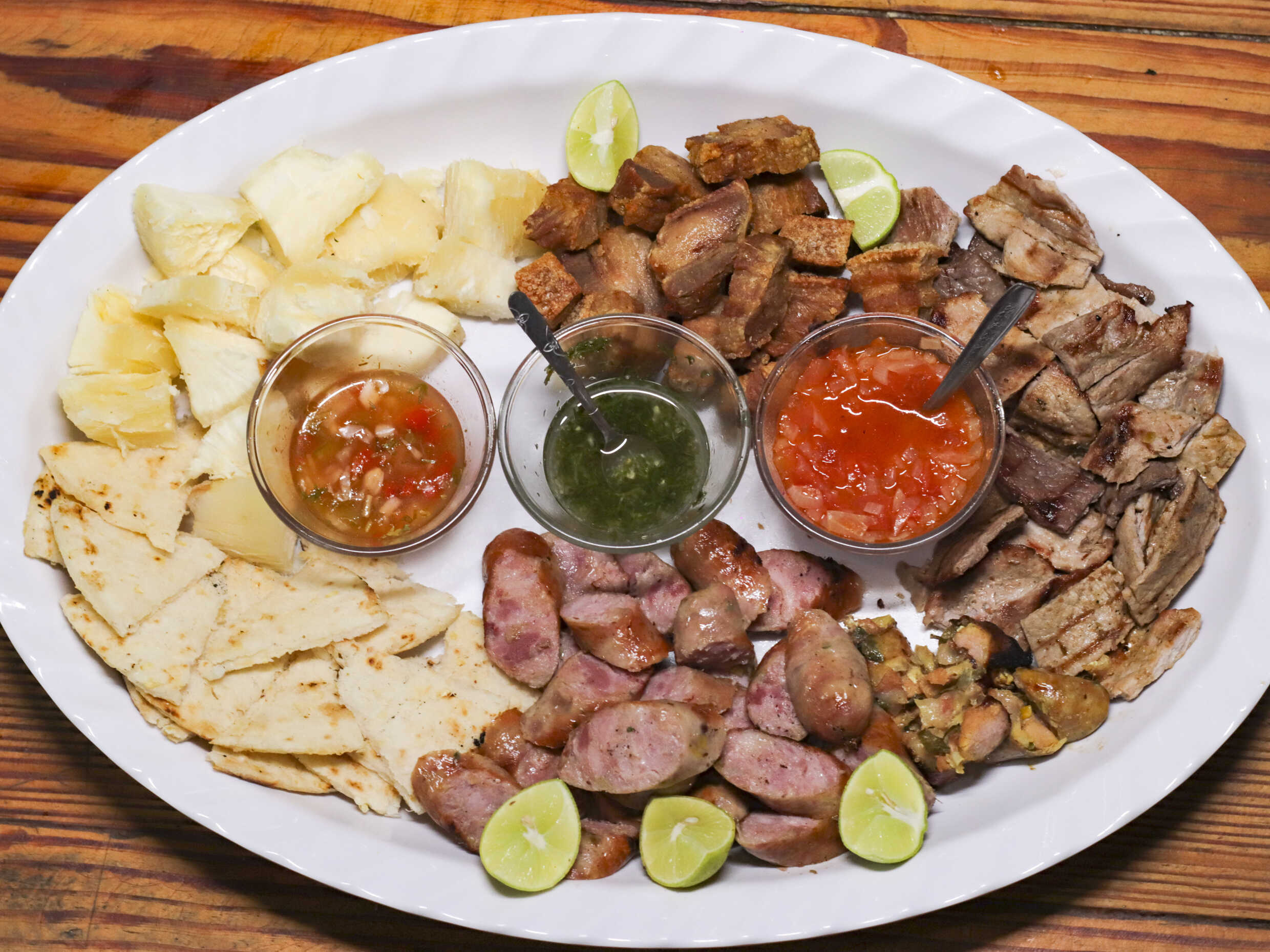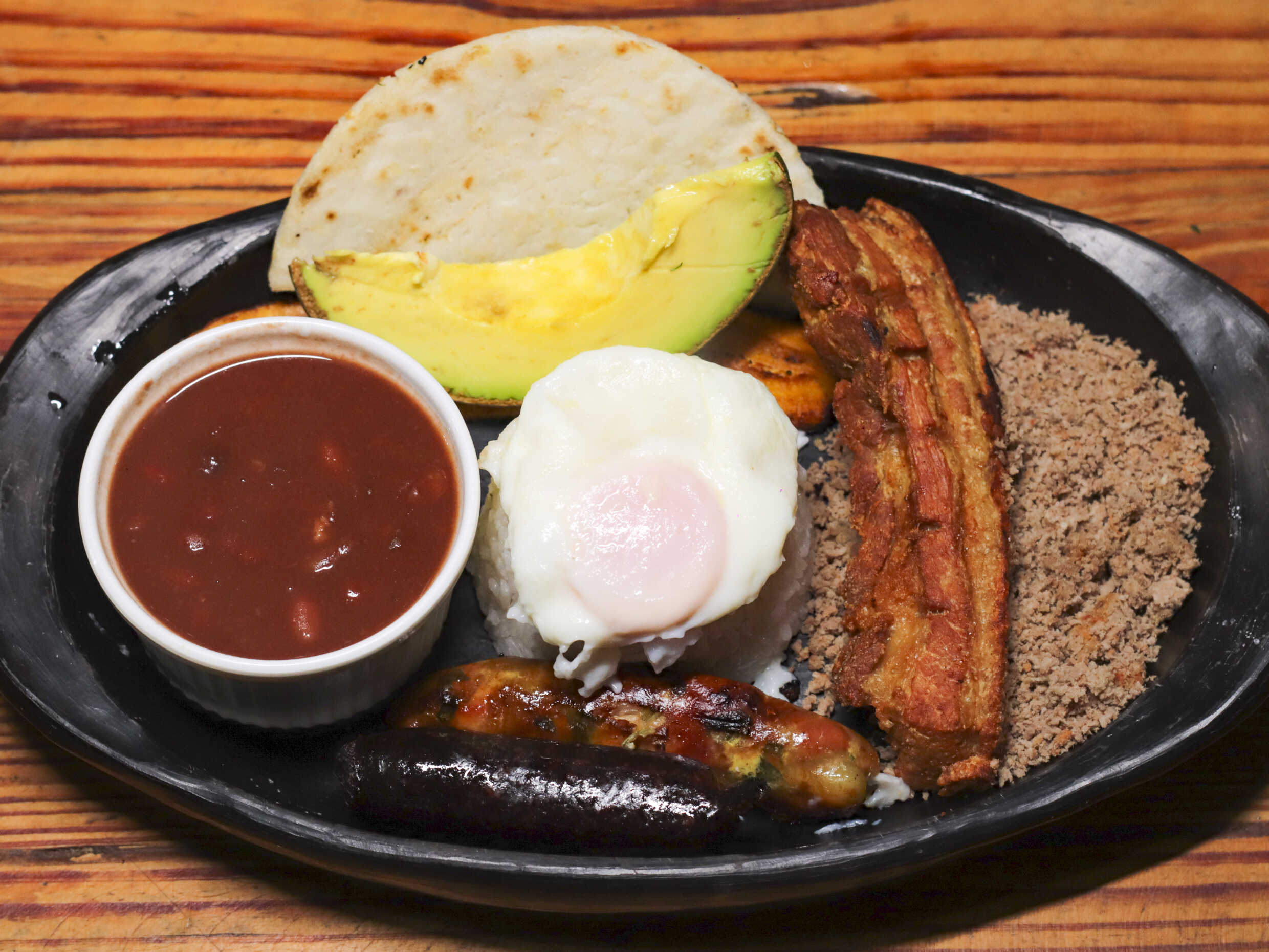 Chicharrón, morcilla, chorizo, porción de yuca, porción de arepa, hogao, chimichurri y picante de la casa.