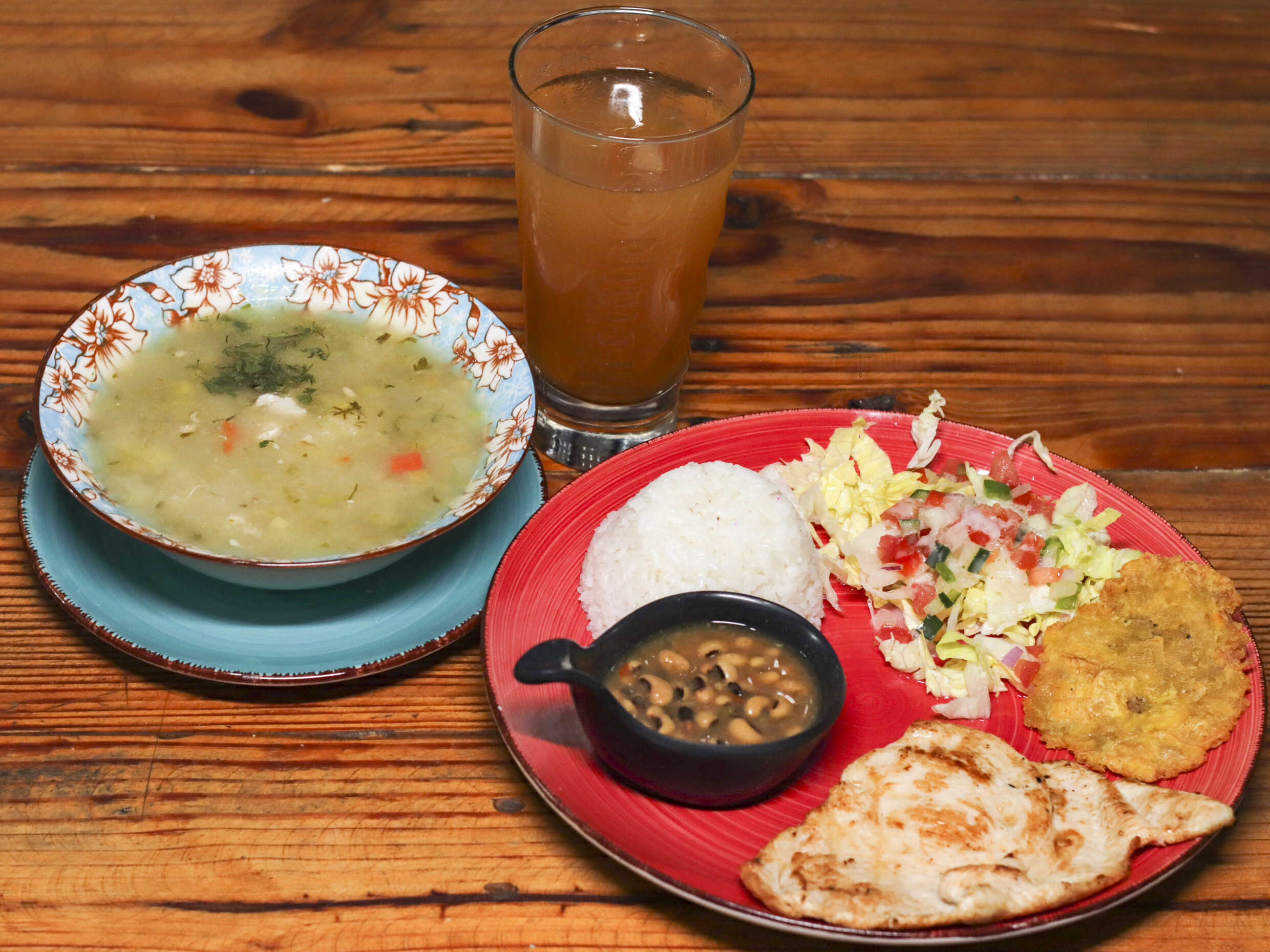 Carne a la parrilla con arroz, sopa, ensalada, guarnición, granos y bebida. (según disponibilidad del día)