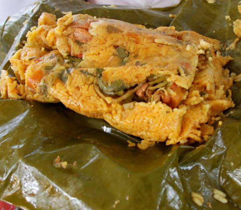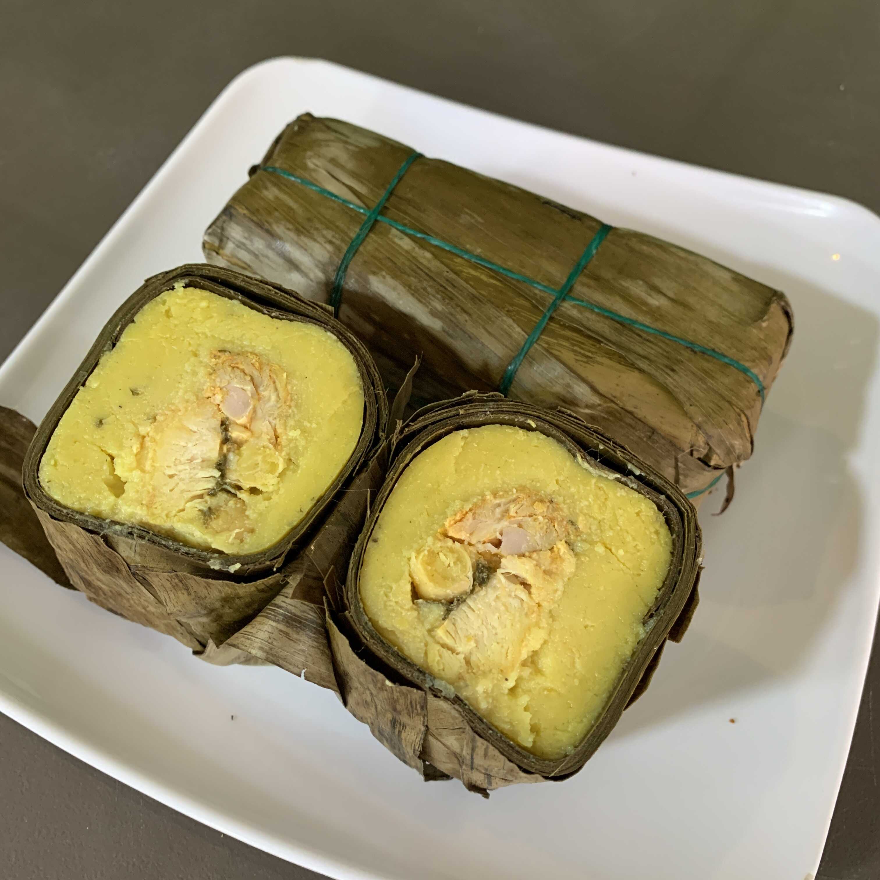 Masa de maíz, con arroz, arvejas, huevo duro, zanahoria, trozo de carne de cerdo, tocino y pollo