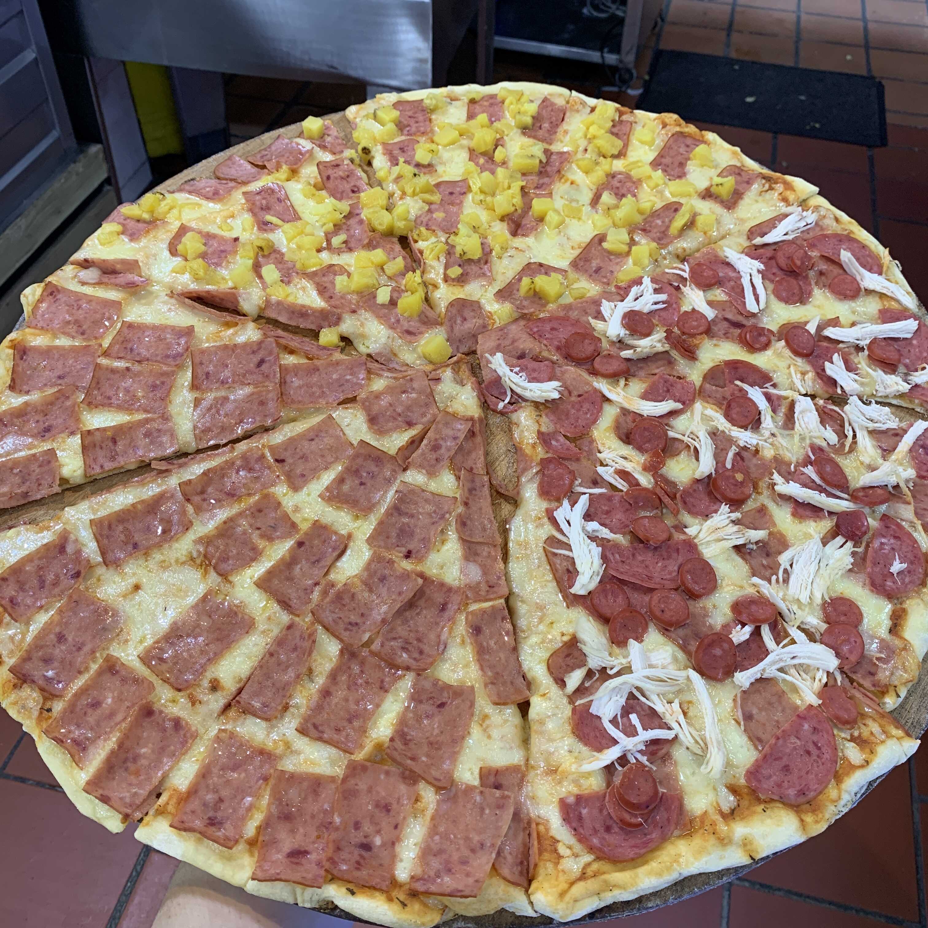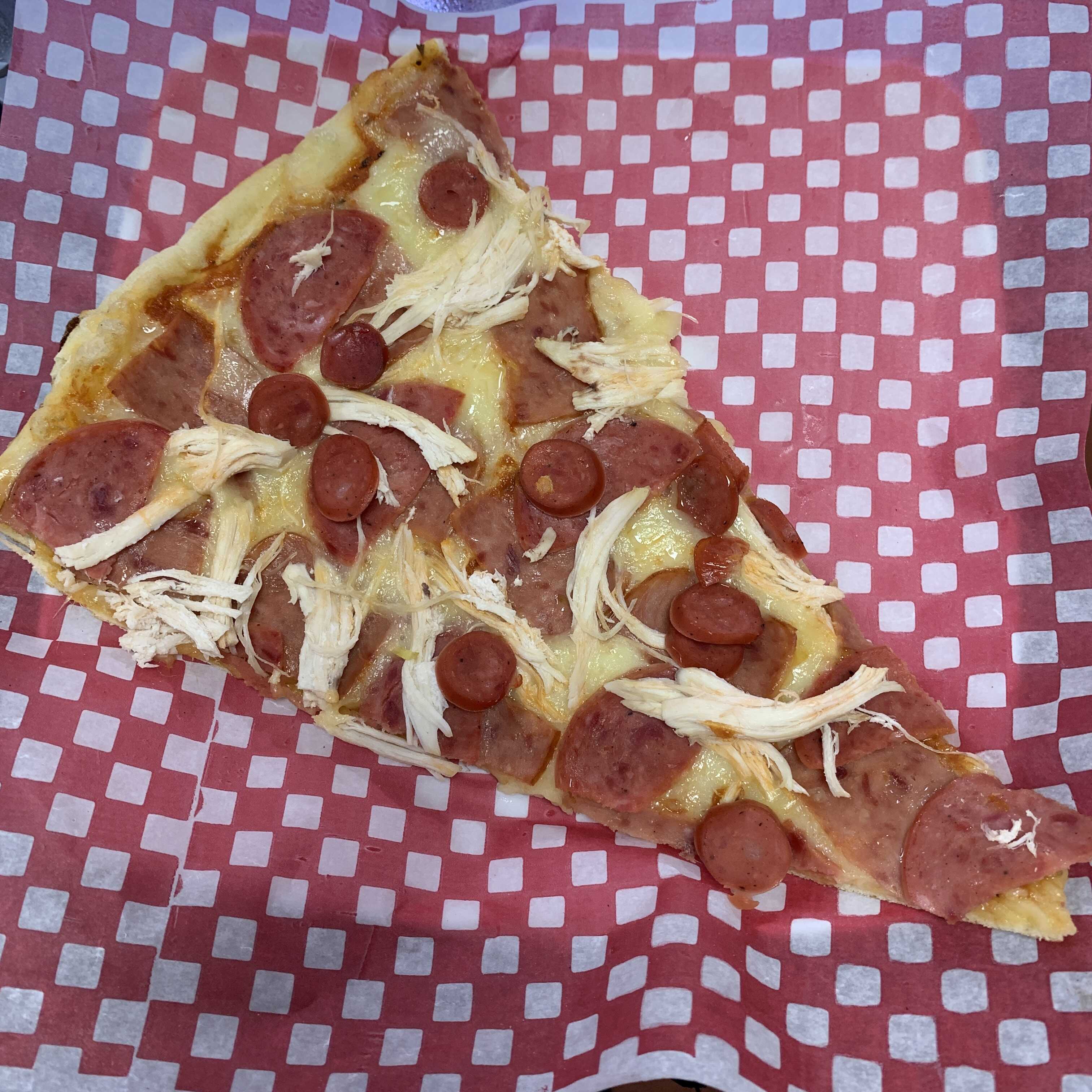 Porción de pizza sabor a: jamón y queso, hawaiana, pollo champiñones, pollo maíz, 4 carnes, pizza perro.