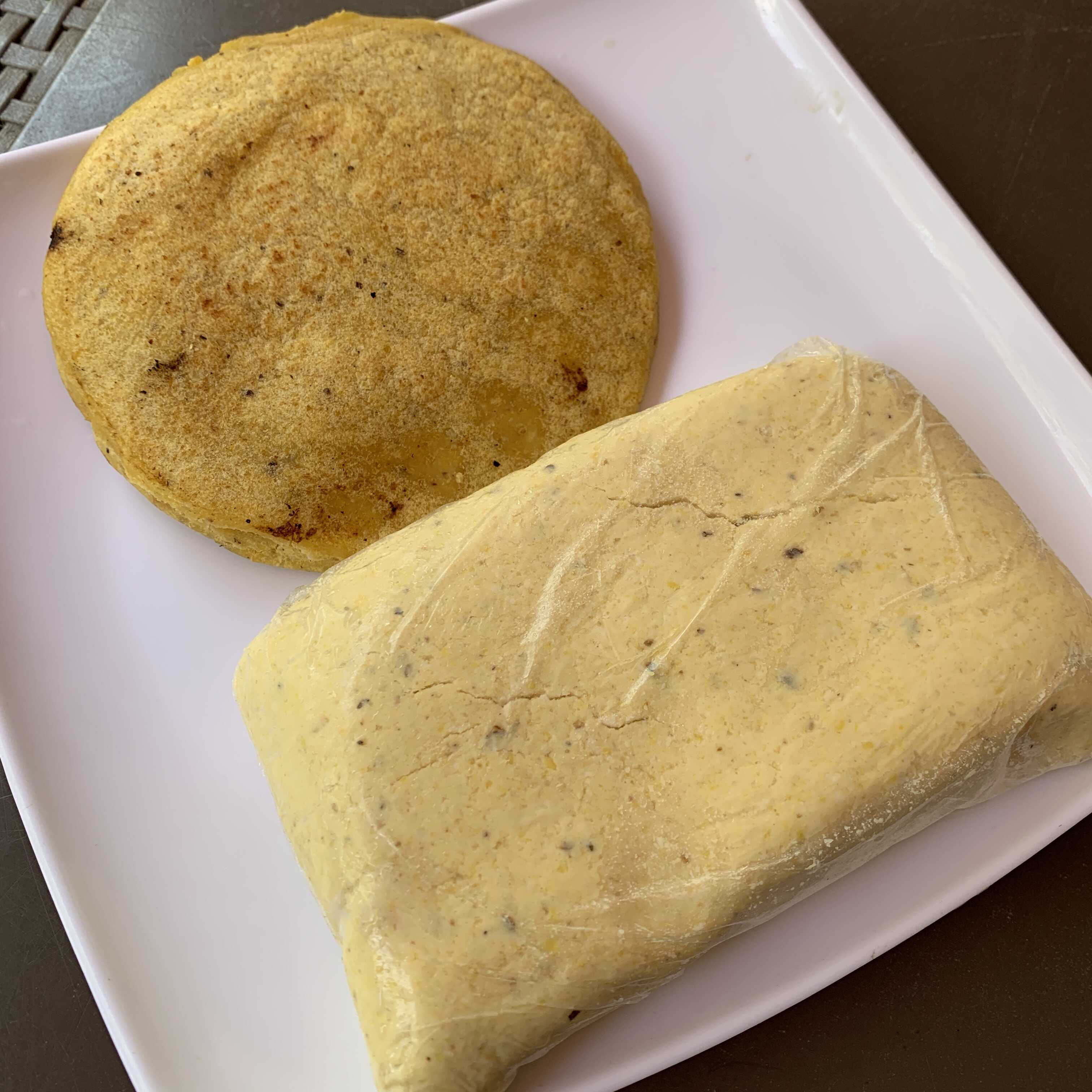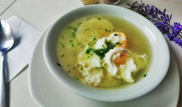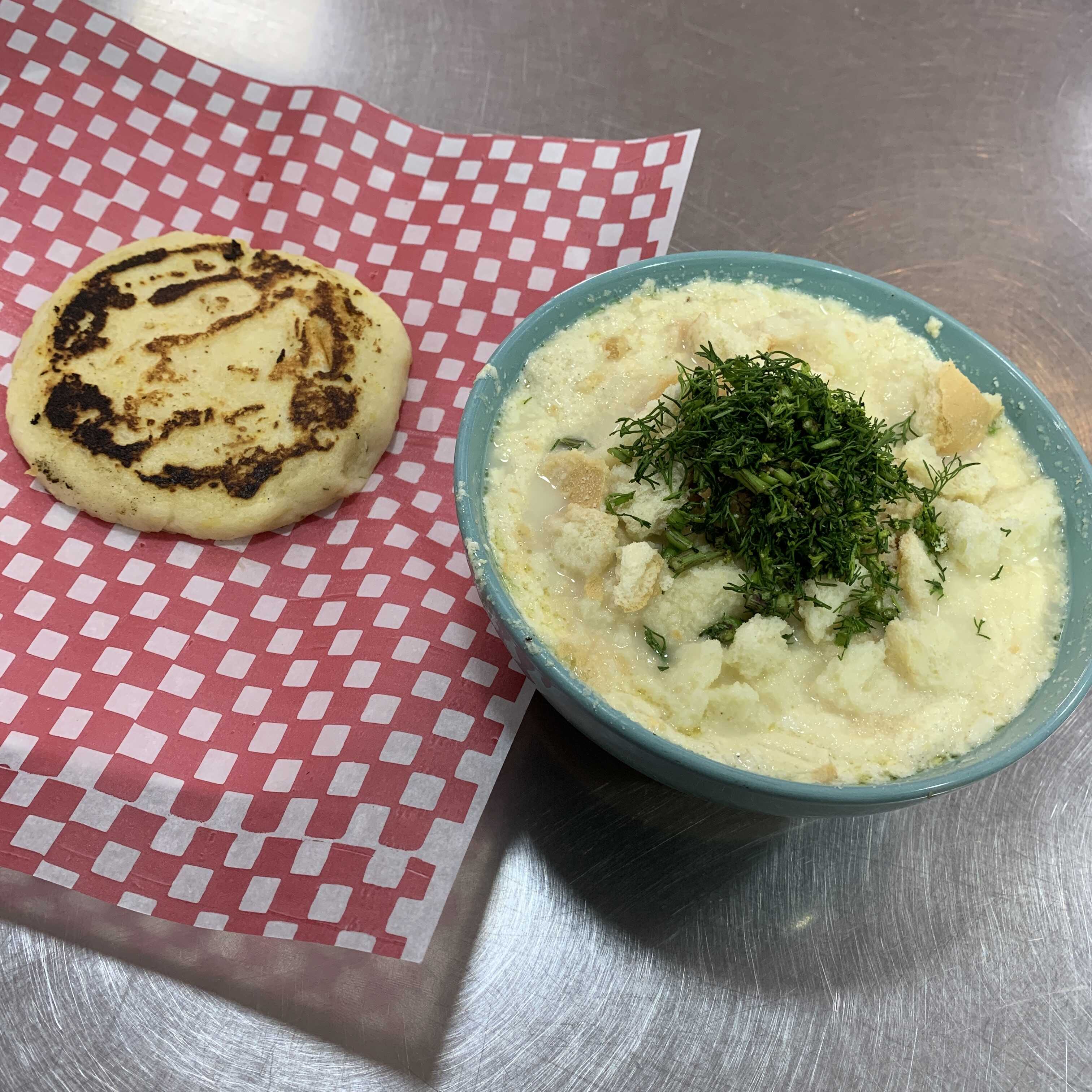 Caldo de huevo con crema de leche, migas de pan y arepa santandereana.