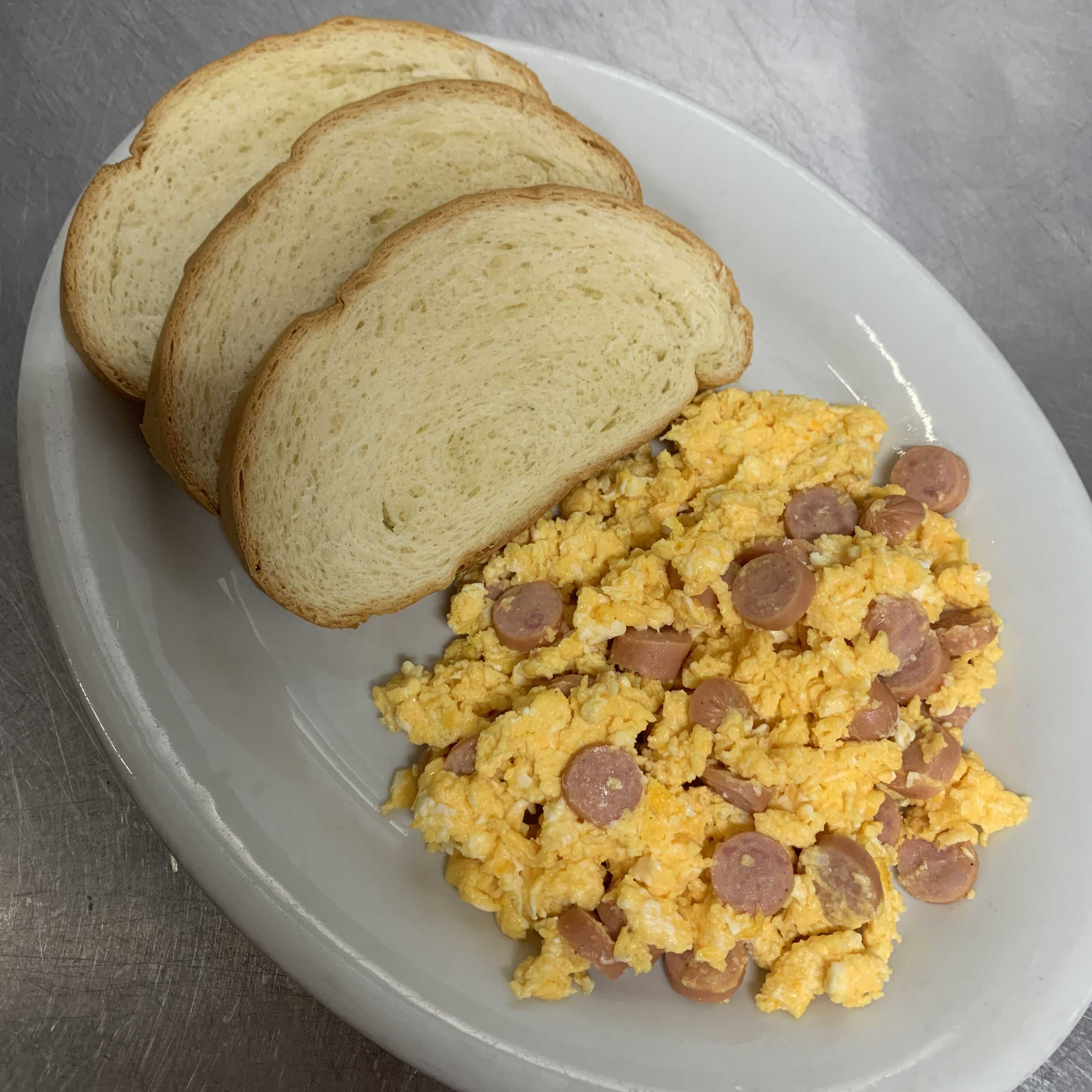 Huevos con cebolla, tomate y salchicha ranchera, con pan o bollo.