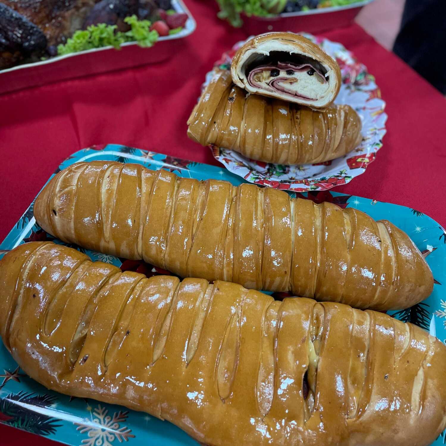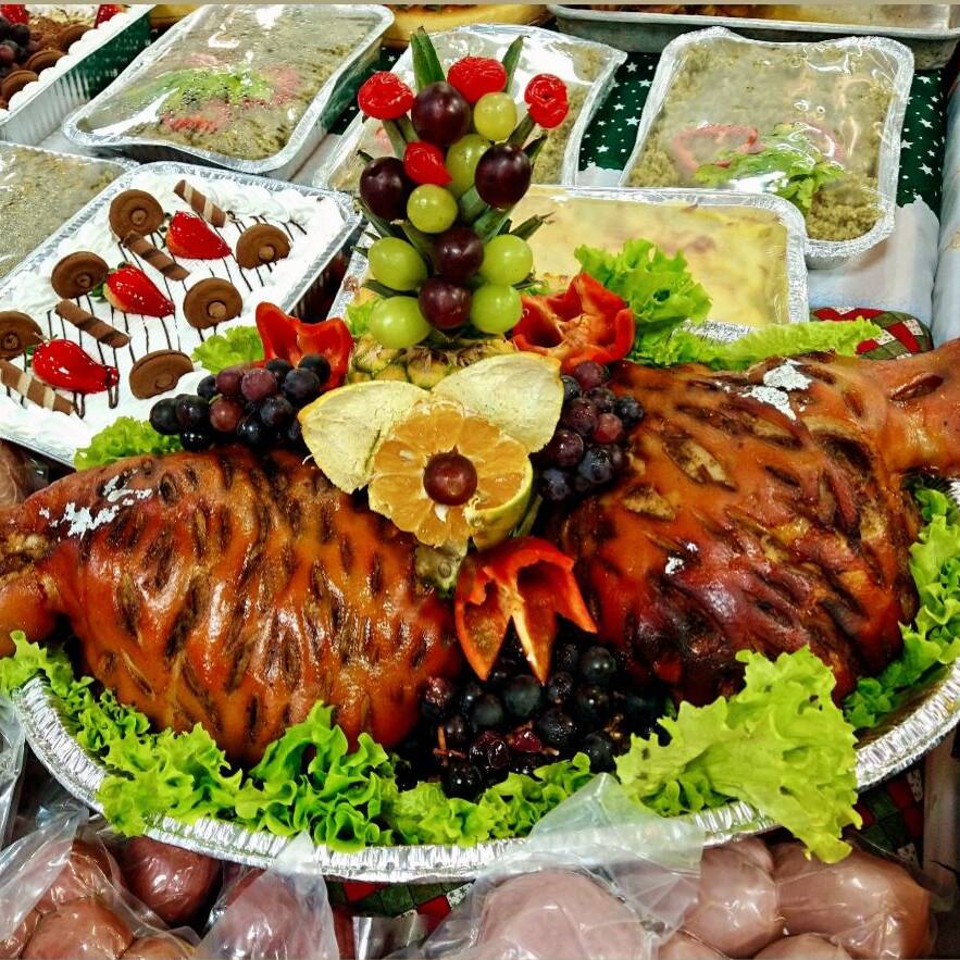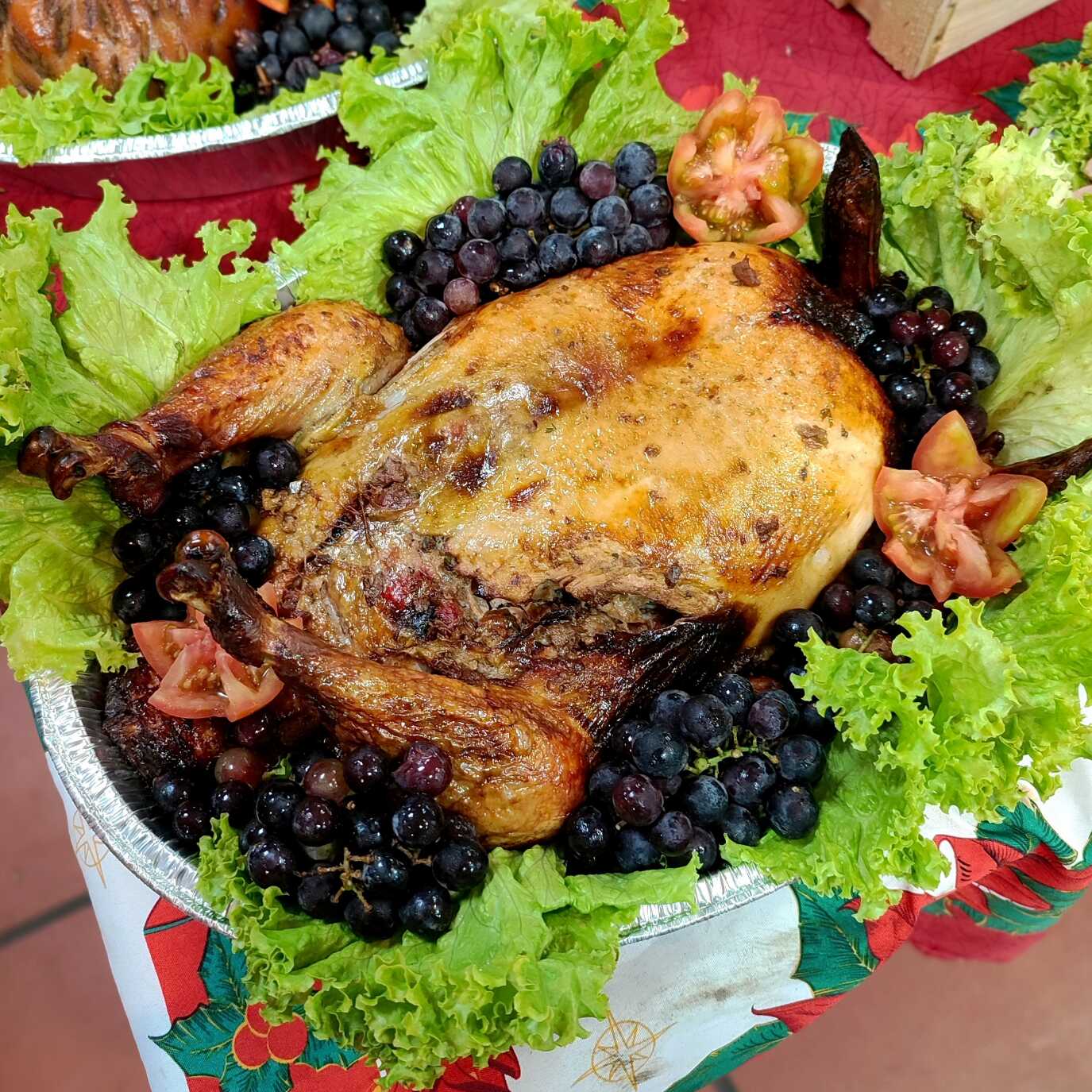 Pavo rellenado de carne molida de res y de cerdo y marinado con vinos y el adobo de la casa y horneado por varias horas hasta llegar al punto de cocción. se puede acompañar con salsa de ciruela o salsa de naranja.