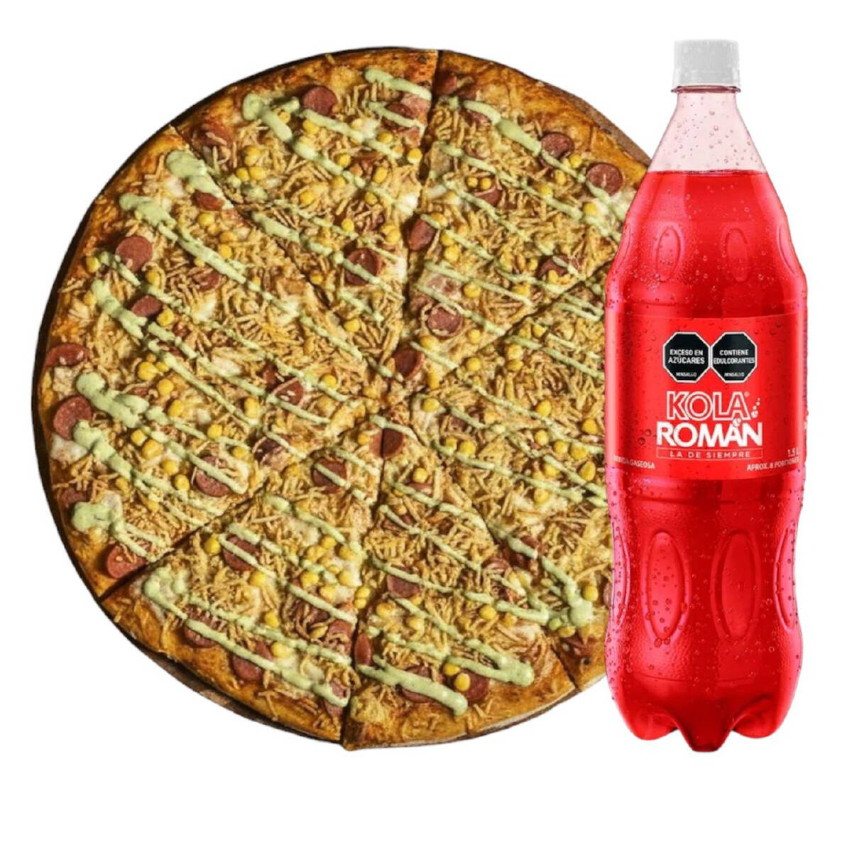Pizza con queso mozarela - papa chongo- chorizo -butifarra- maíz -salsa tártara y salsa de piña con posibilidad de dividirse de 8 - 12 - 16 porciones + kola roman 1.5 adicional