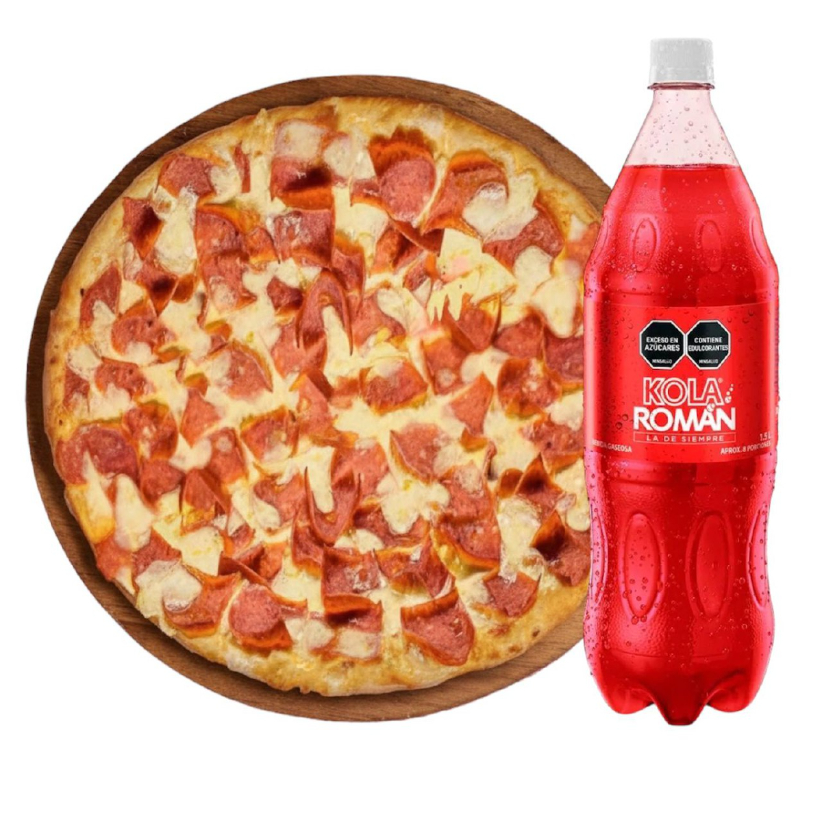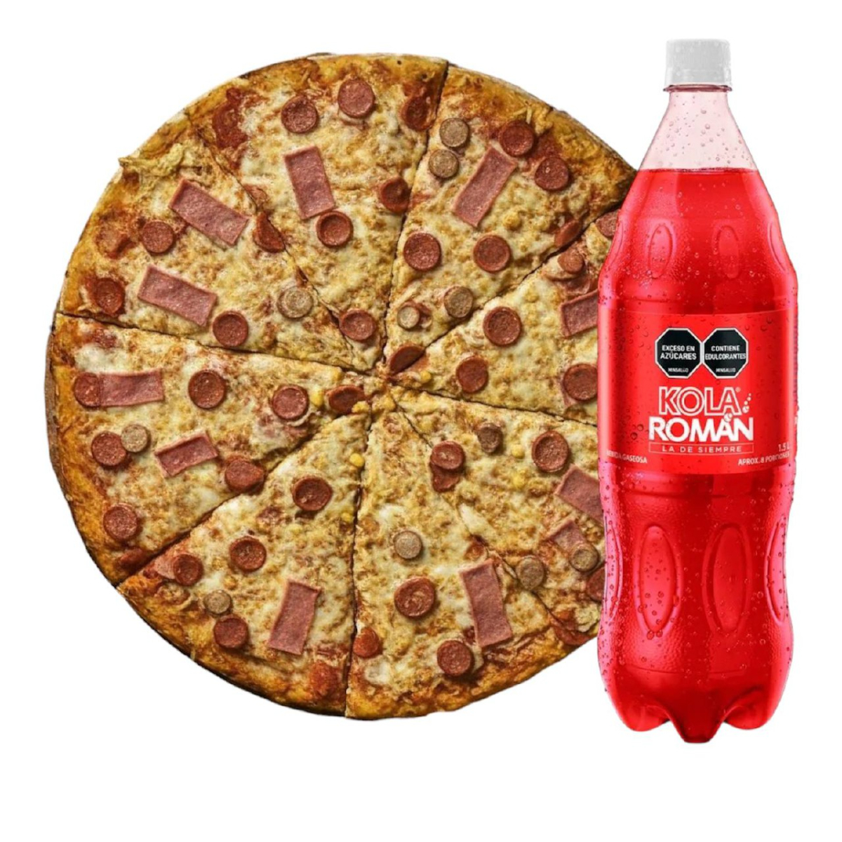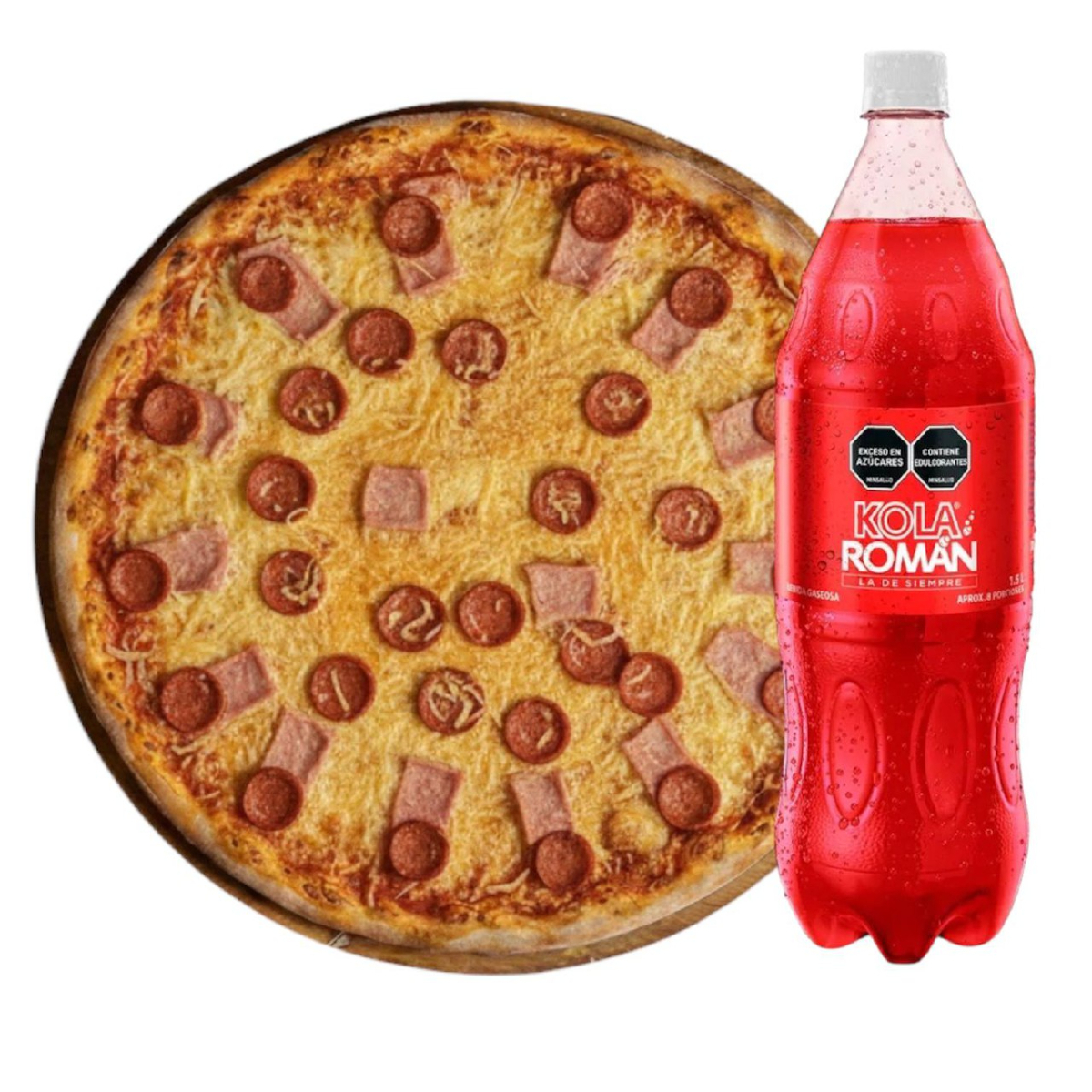 Pizza con queso mozarela con - pepperoni - salami y jamón con posibilidad de dividirse de 8 - 12 - 16 porción + kola roman 1.5 adicional