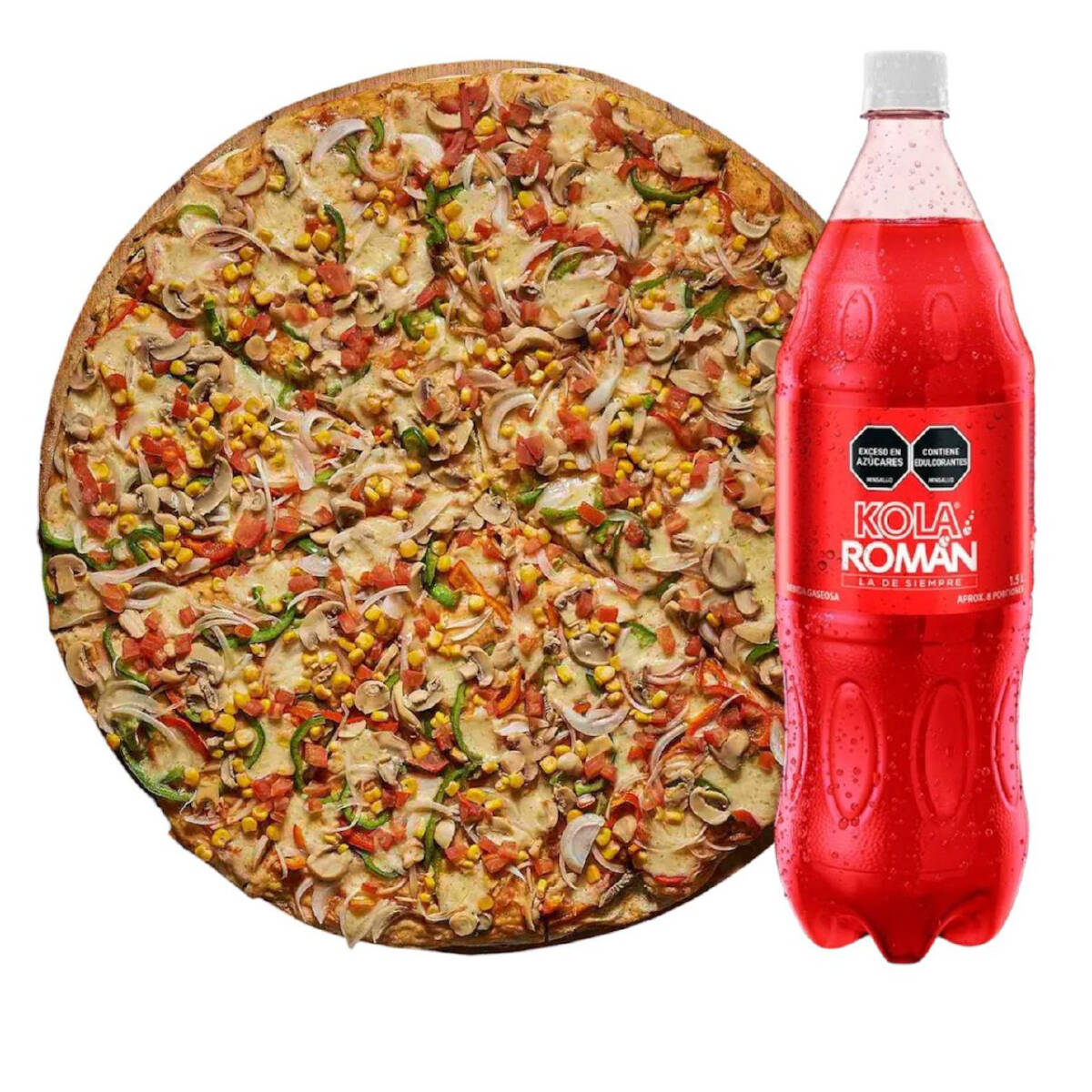 Pizza con queso mozarela - salami-pollo-pimentón verde - pimentón rojo - cebolla blanca - champiñón y maíz con posibilidad de dividirse de 8 - 12 - 16 porciones + kola roman 1.5 adicional