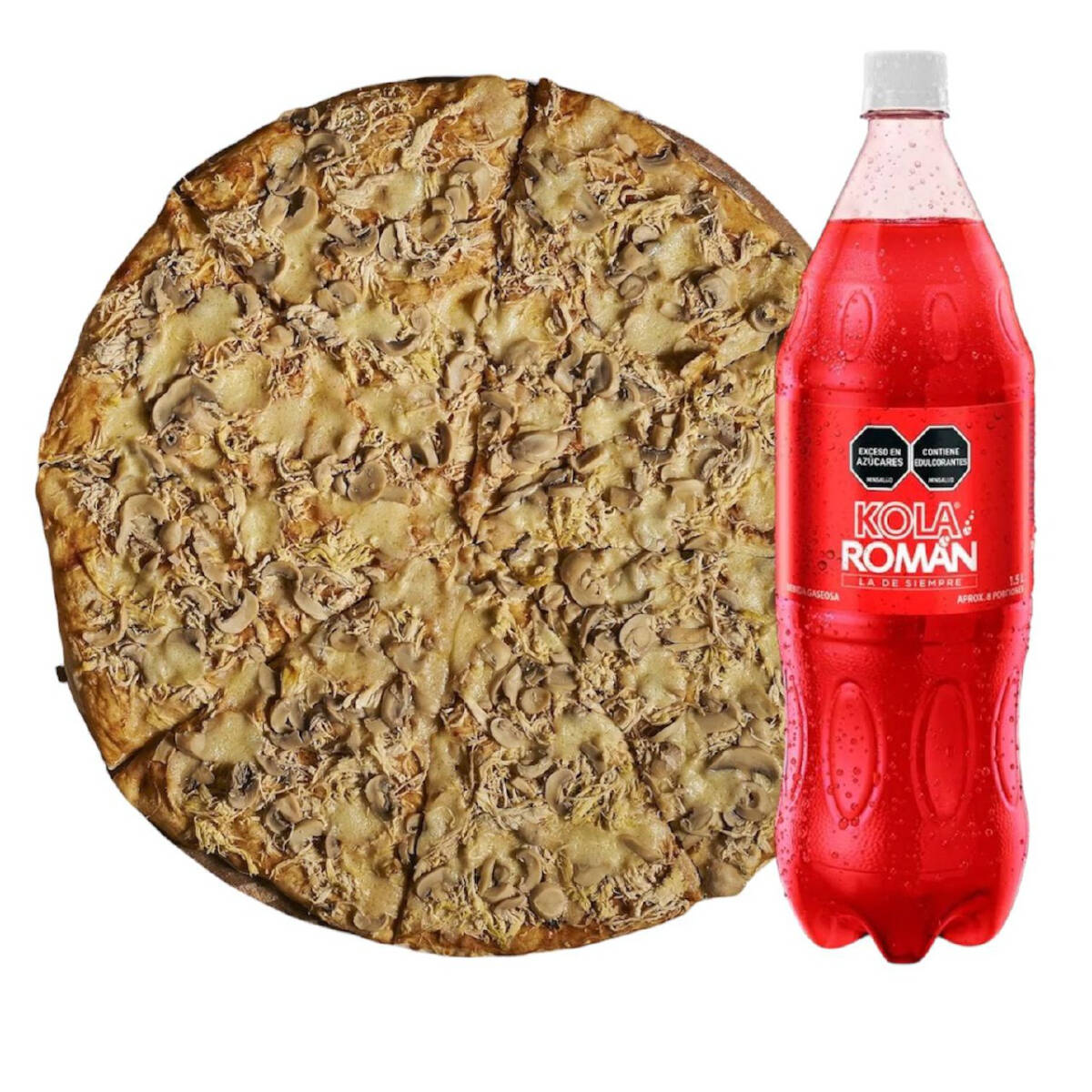 Pizza con queso mozarela - pollo- champiñones con posibilidad de dividirse de 8 - 12 - 16 porciones + kola roman 1.5 adicional
