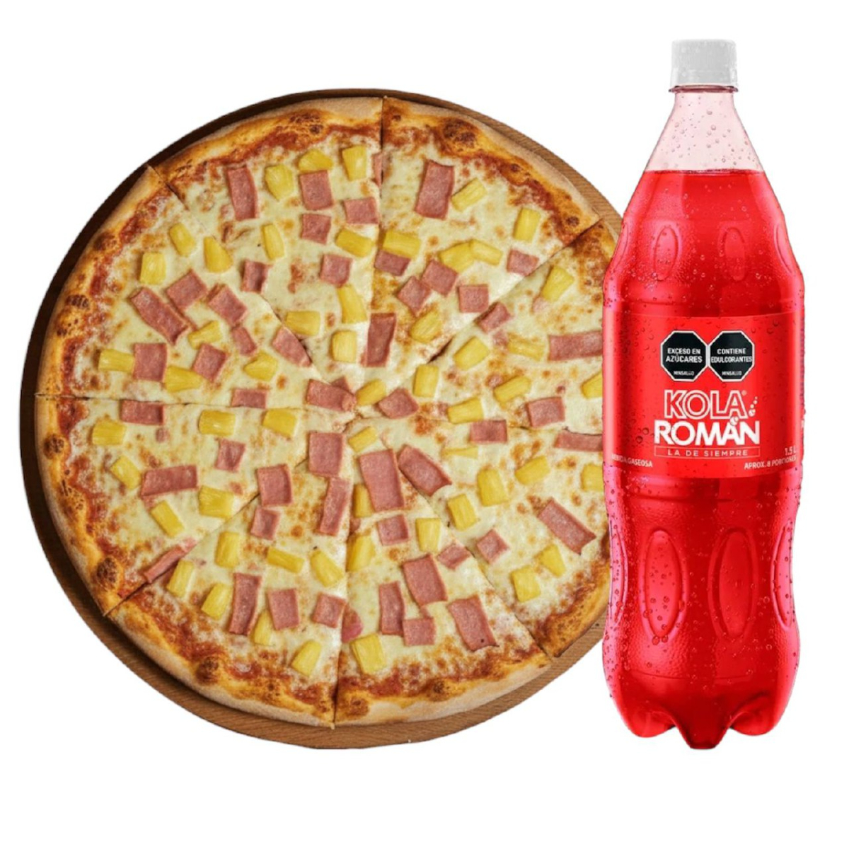 Pizza tradicional con queso mozarela - jamón piña en cubos con posibilidad dividirse de 8 - 12 - 16 porciones + kola roman 1.5 adicional