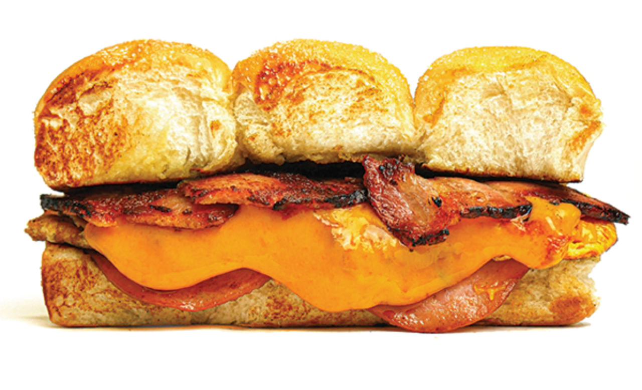 Pan piñita x 3, tocineta, jamón de cerdo, jamón de pavo, queso cheddar y huevo omelette.