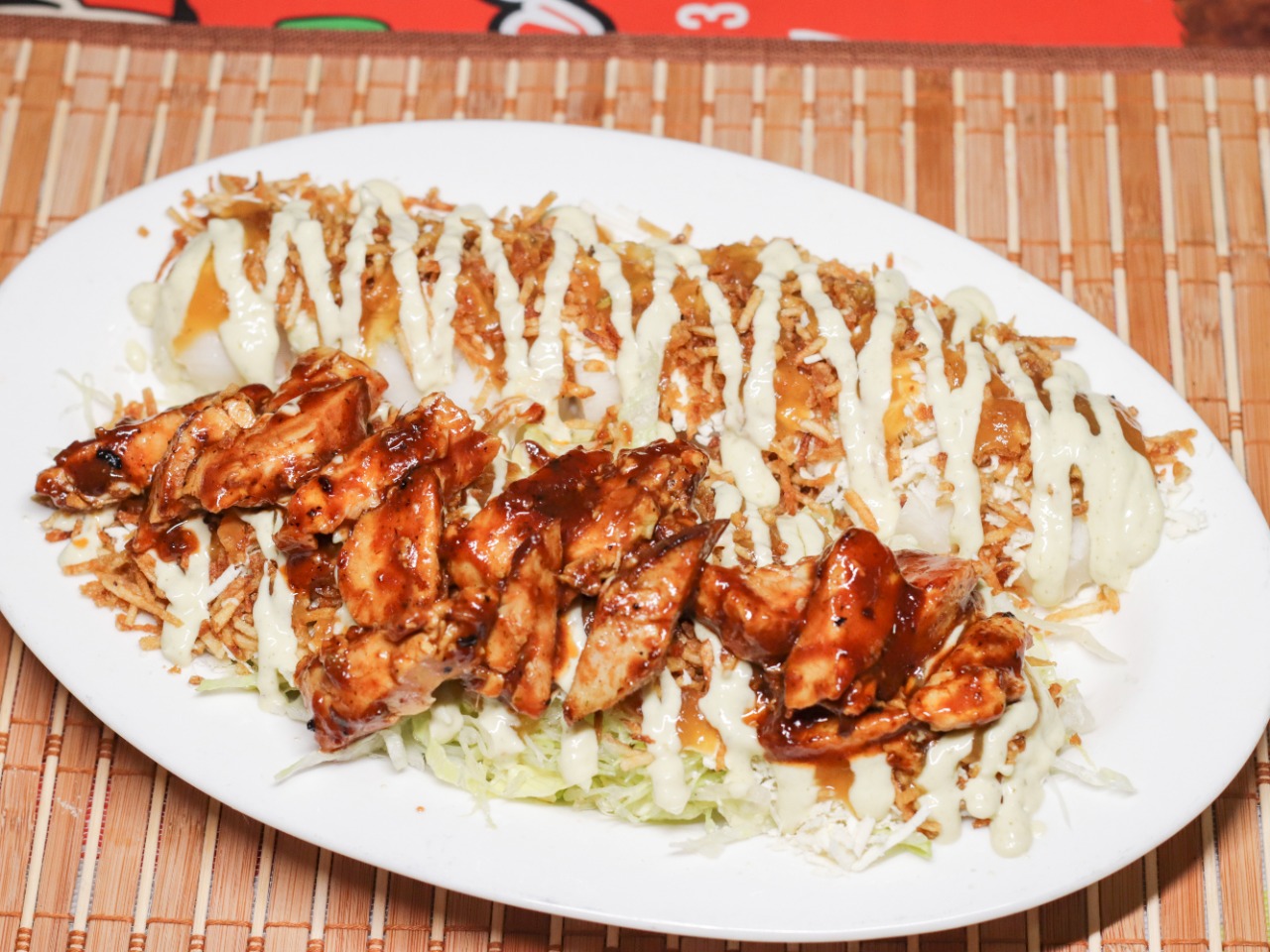 Papas a la francesa, chorizo, butifarra, pollo, lomo de cerdo, Salteado de pimenton y cebolla en aceite de oliva, BBQ, Piña, Tartara