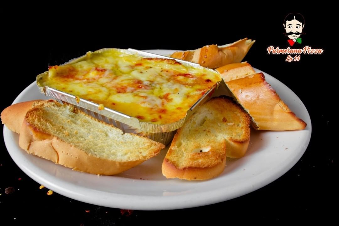 Pizza 3 quesos porción. Ingredientes: masa de la casa, queso parmesano, holandes y mozzarella.