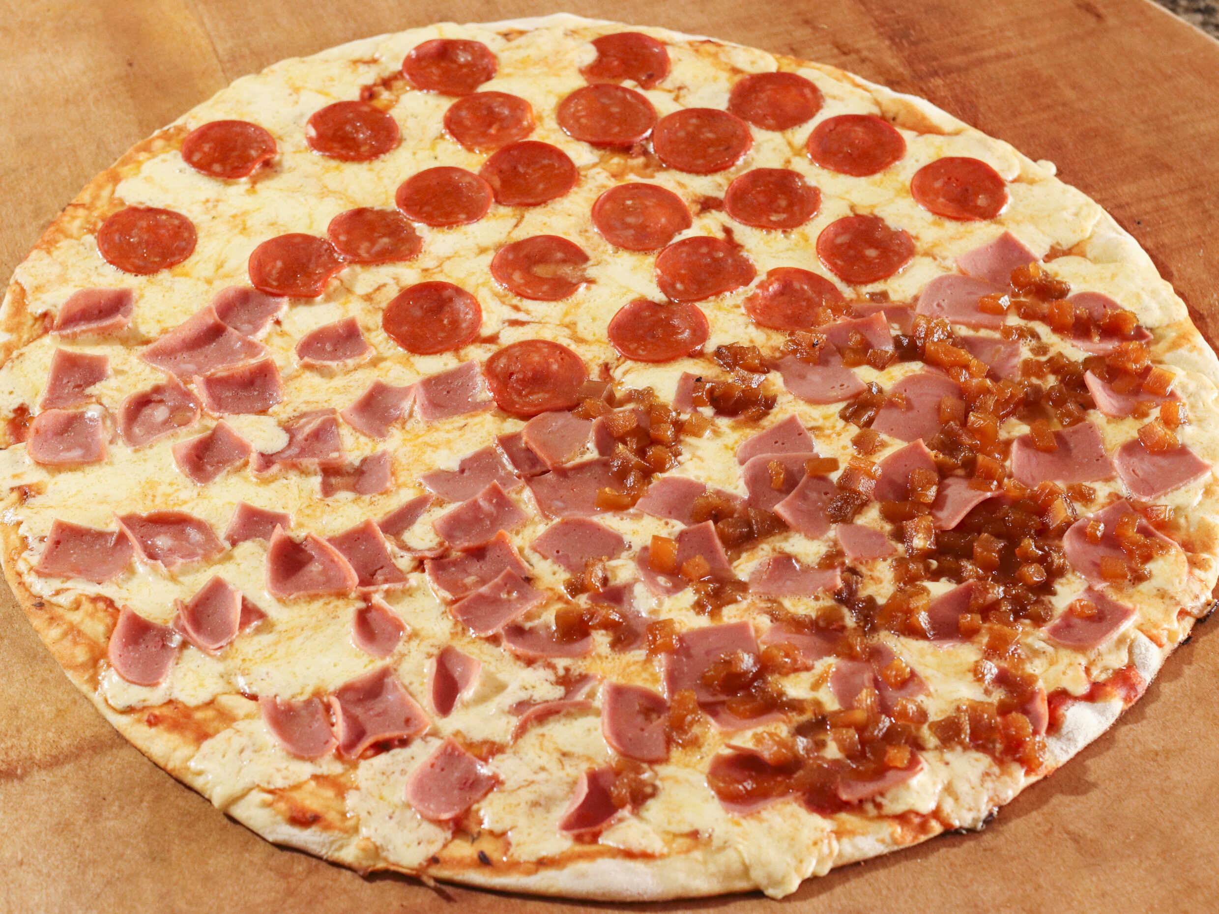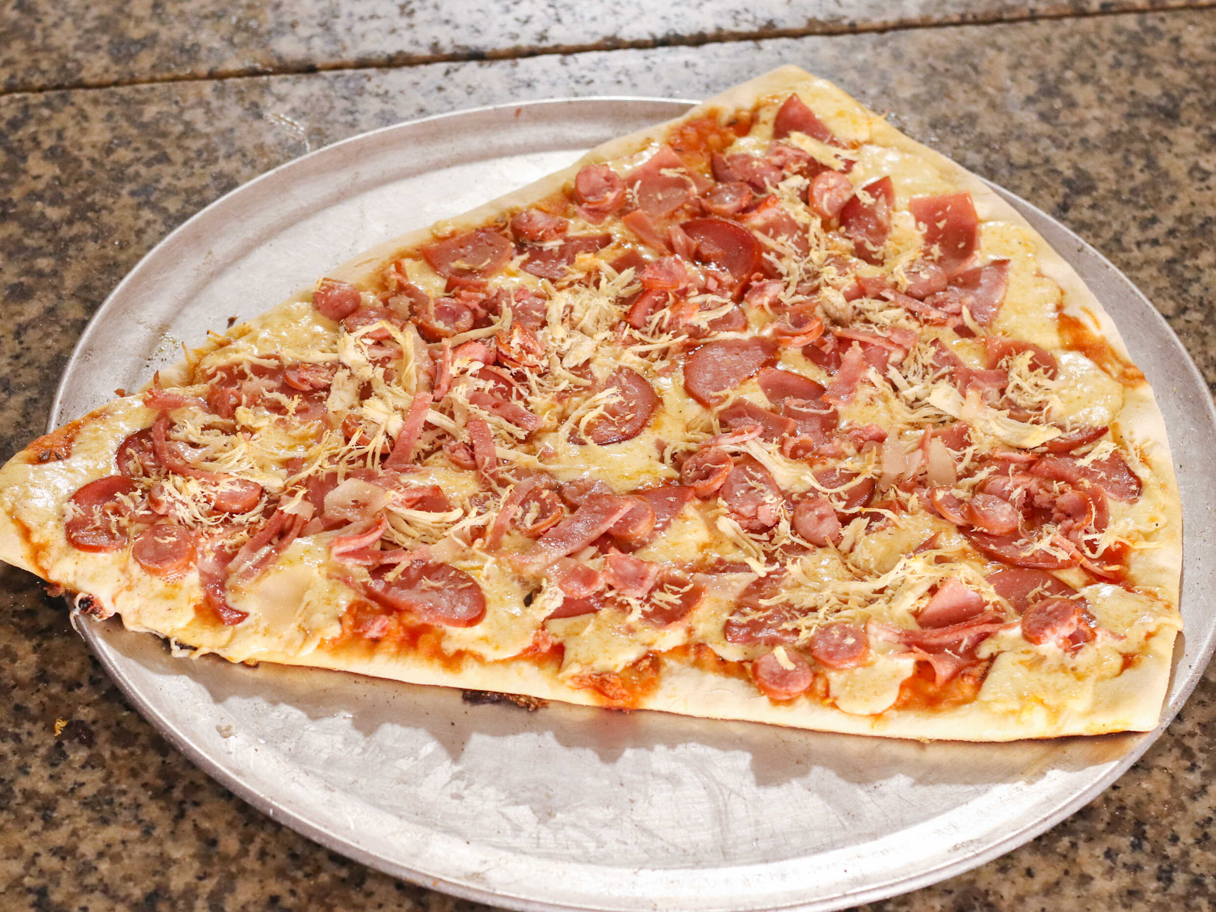 Masa de la casa, pollo, salami, pepperoni, jamón y queso mozzarella.