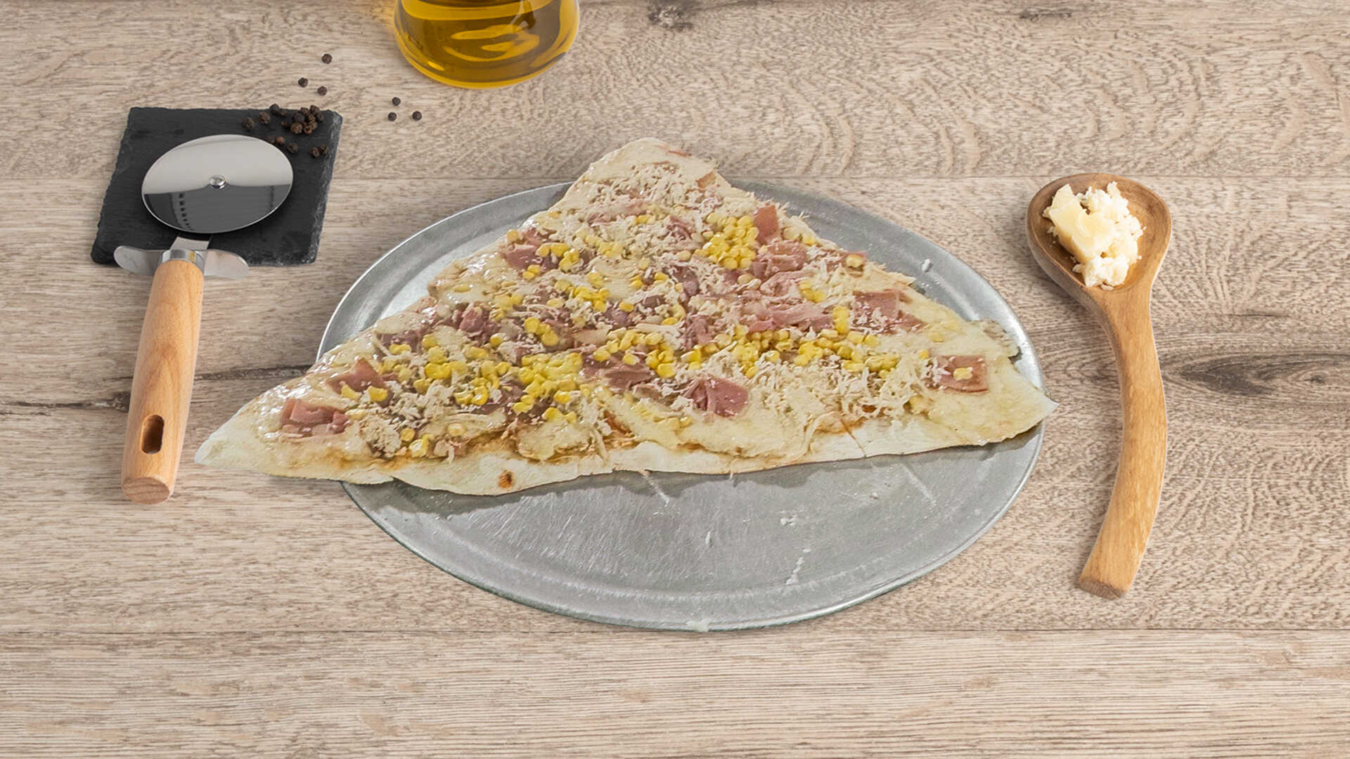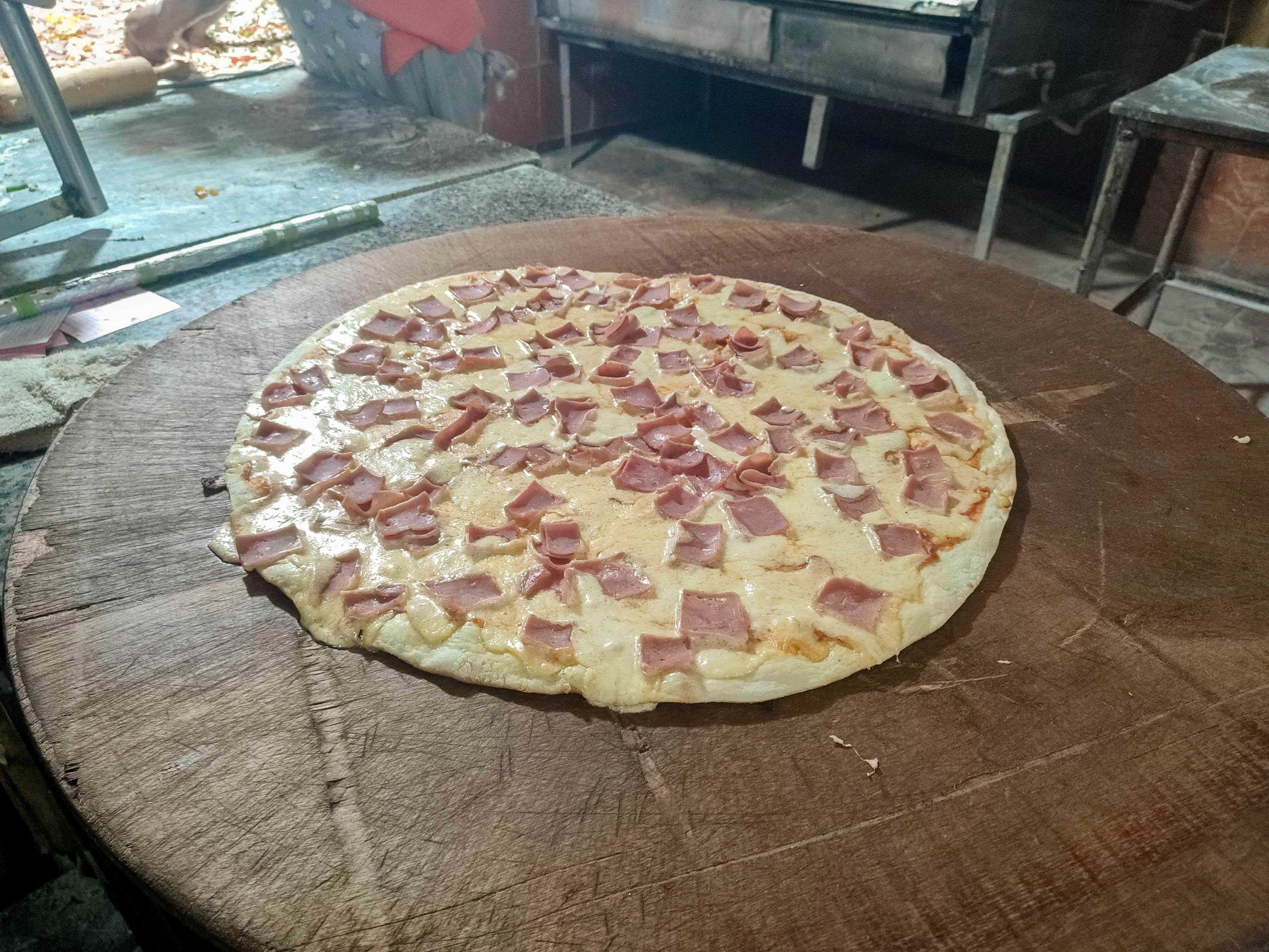Masa de la casa, pollo, tocineta, jamón, maíz y queso parmesano.