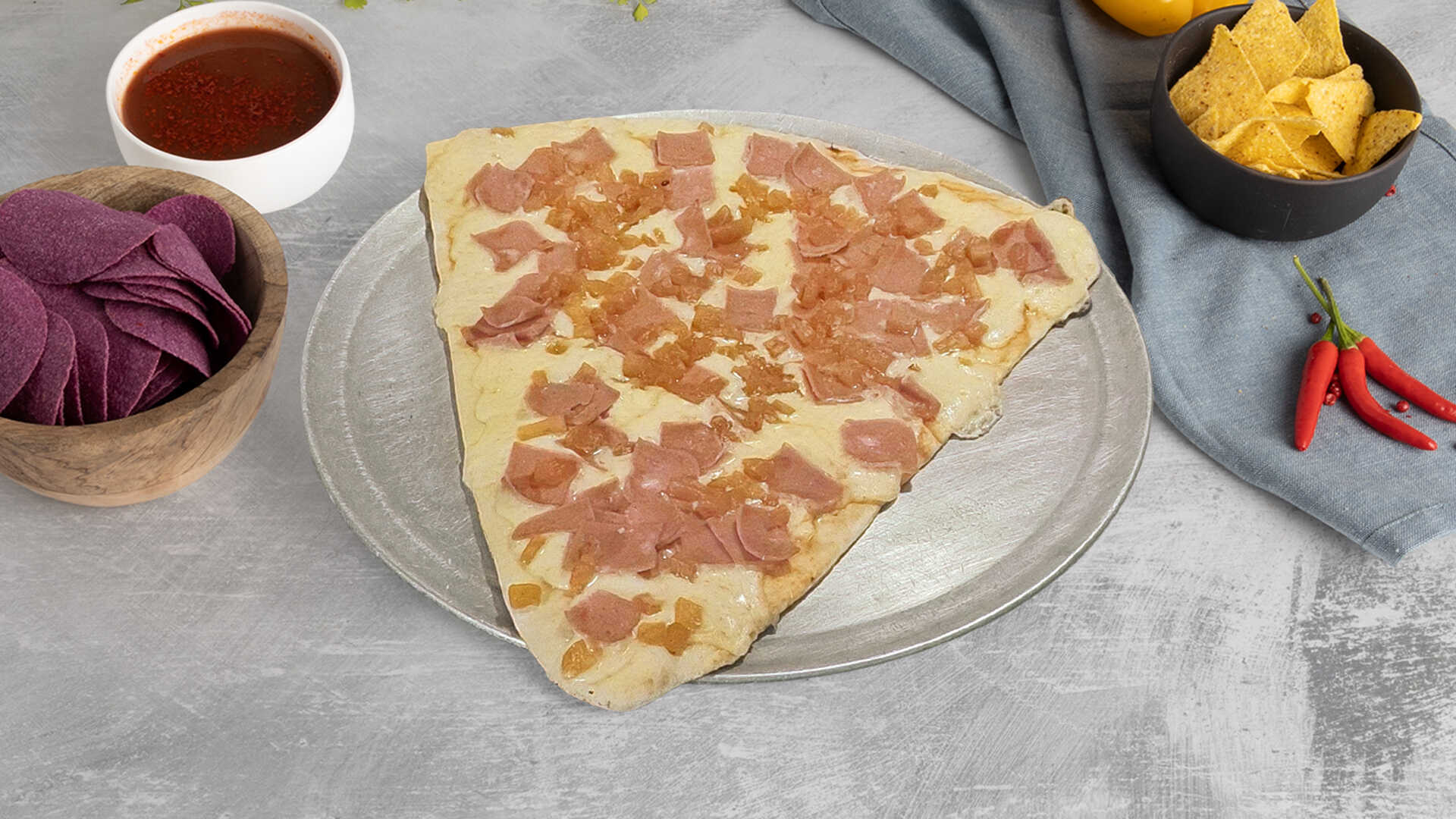 Masa de la casa, piña caramelizada, jamón y queso mozzarella.