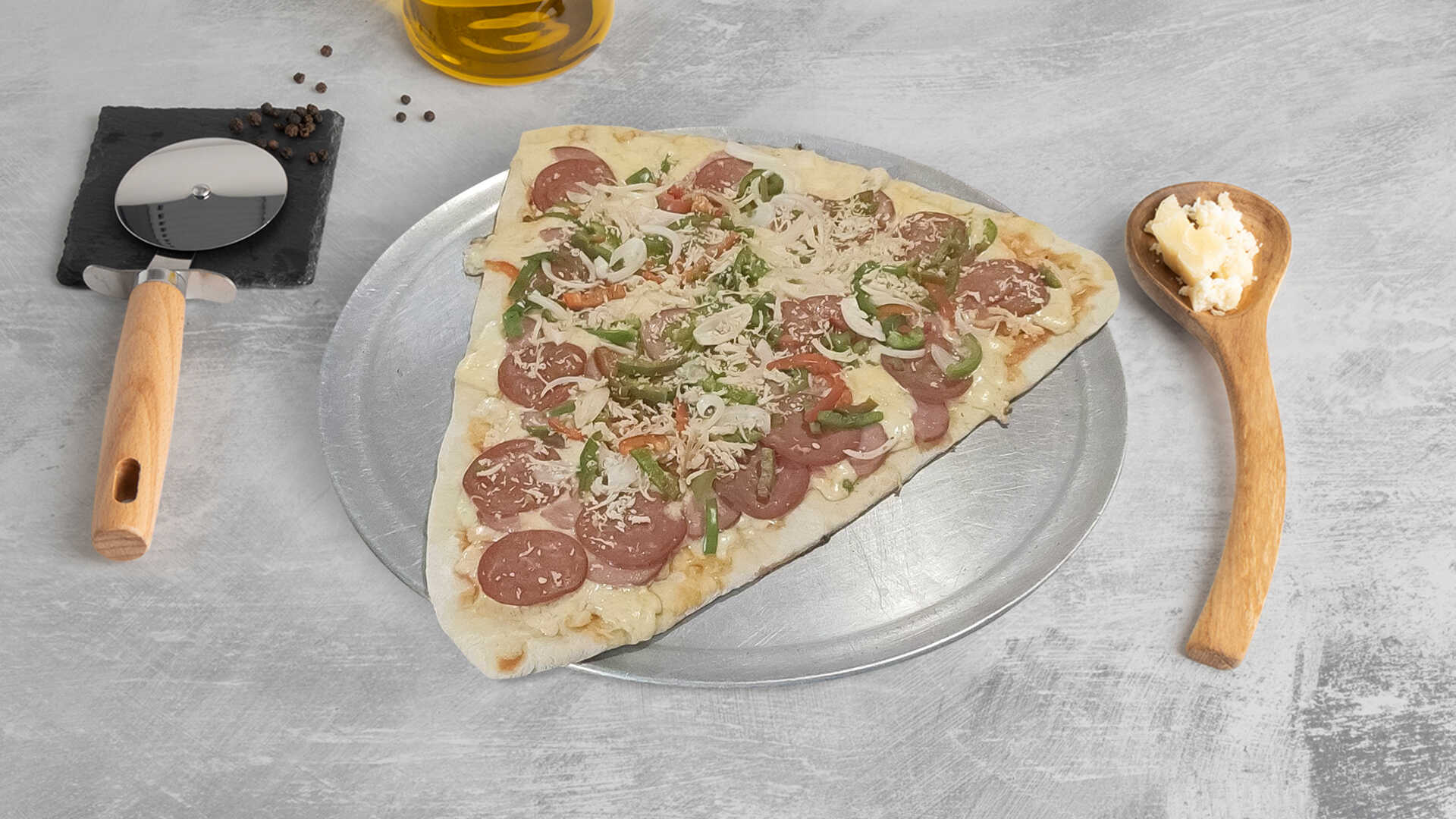 Masa de la casa, pollo, pimentón, cebolla blanca y salami.