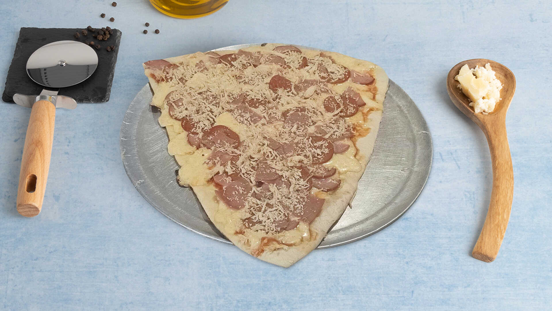 Masa de la casa, salami y queso mozzarella.