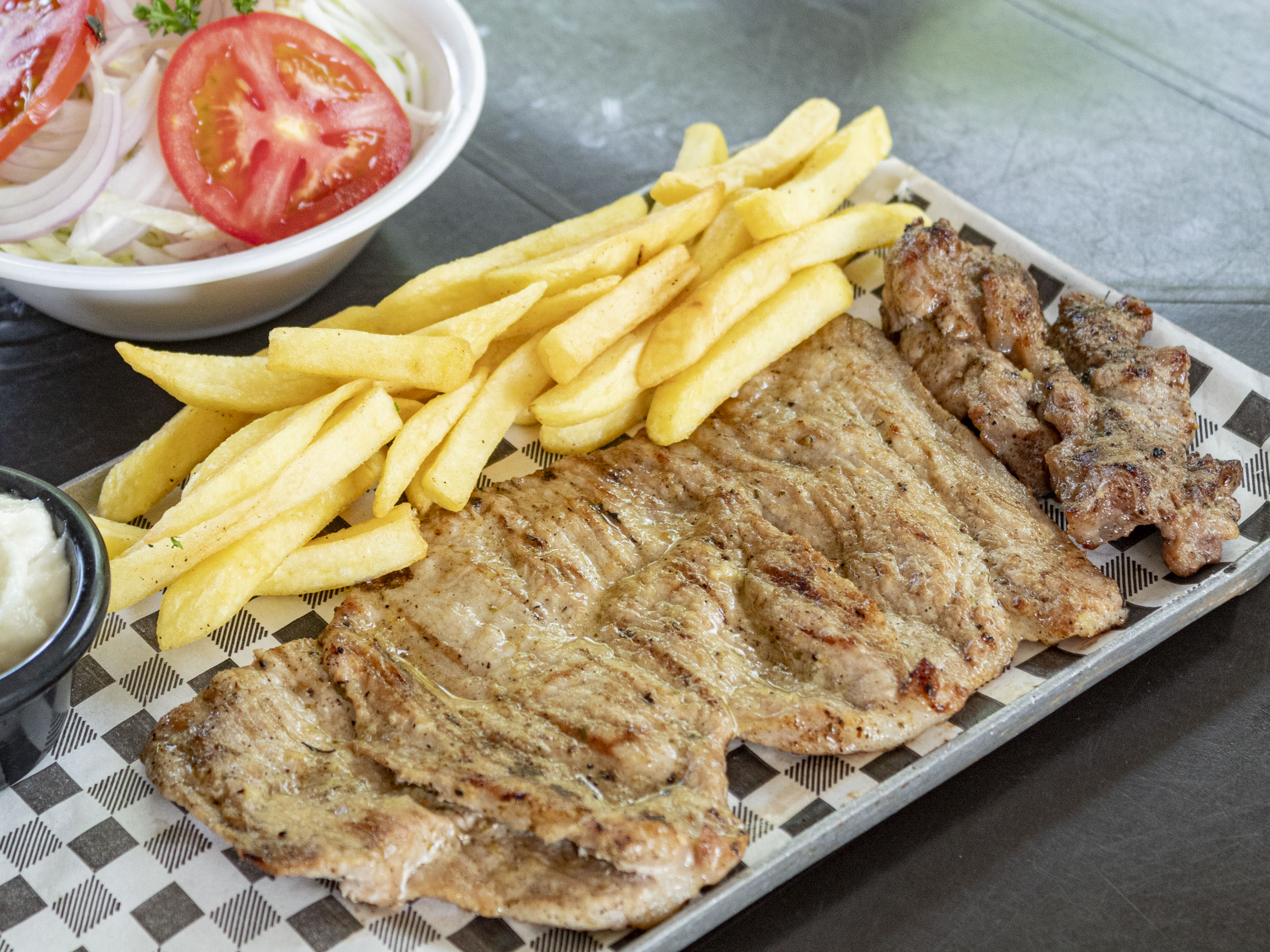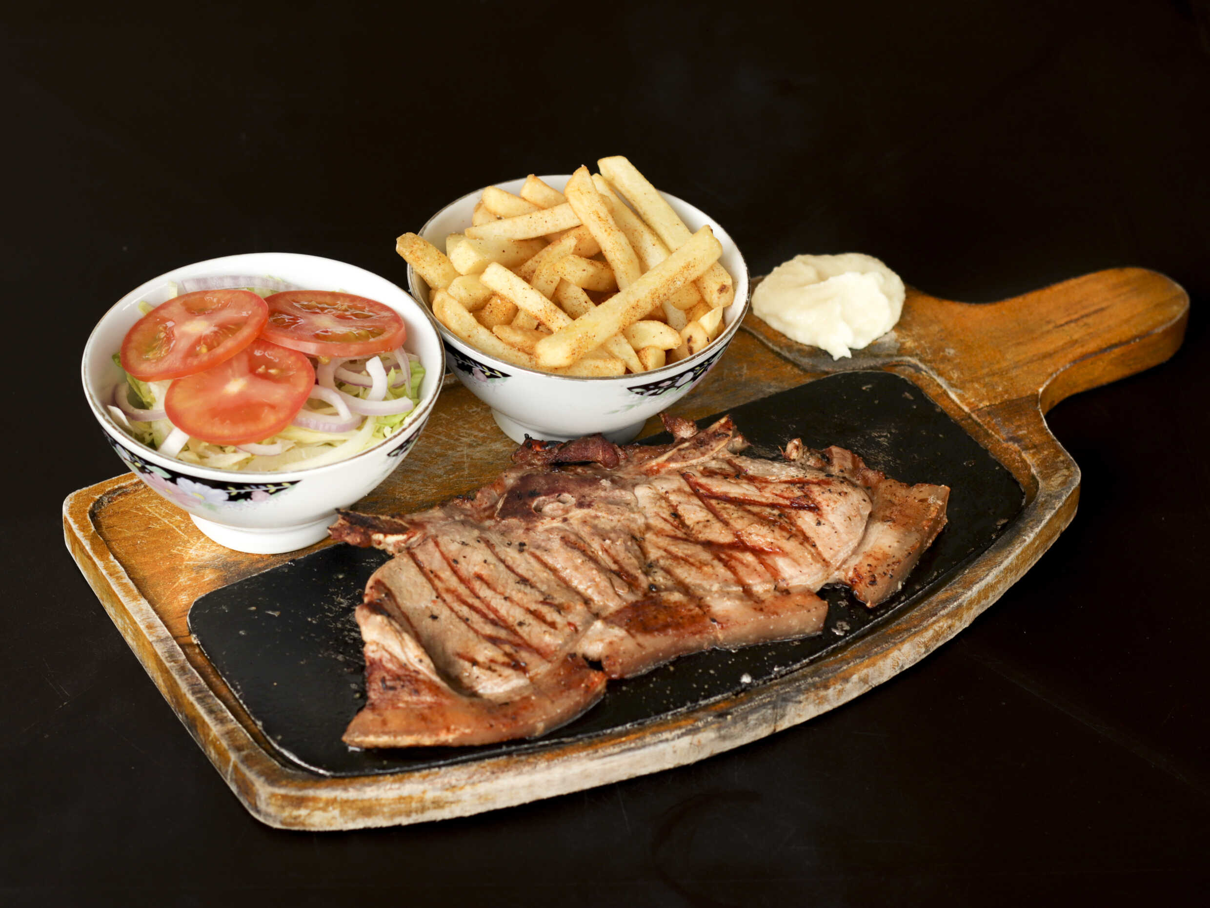 Chuleta de 300 gr asada, acompañada de 200 g de papa francesa, una onza de salsa de ajo, una onza de salsa de tomate, ensalada de lechuga, cebolla y tomate