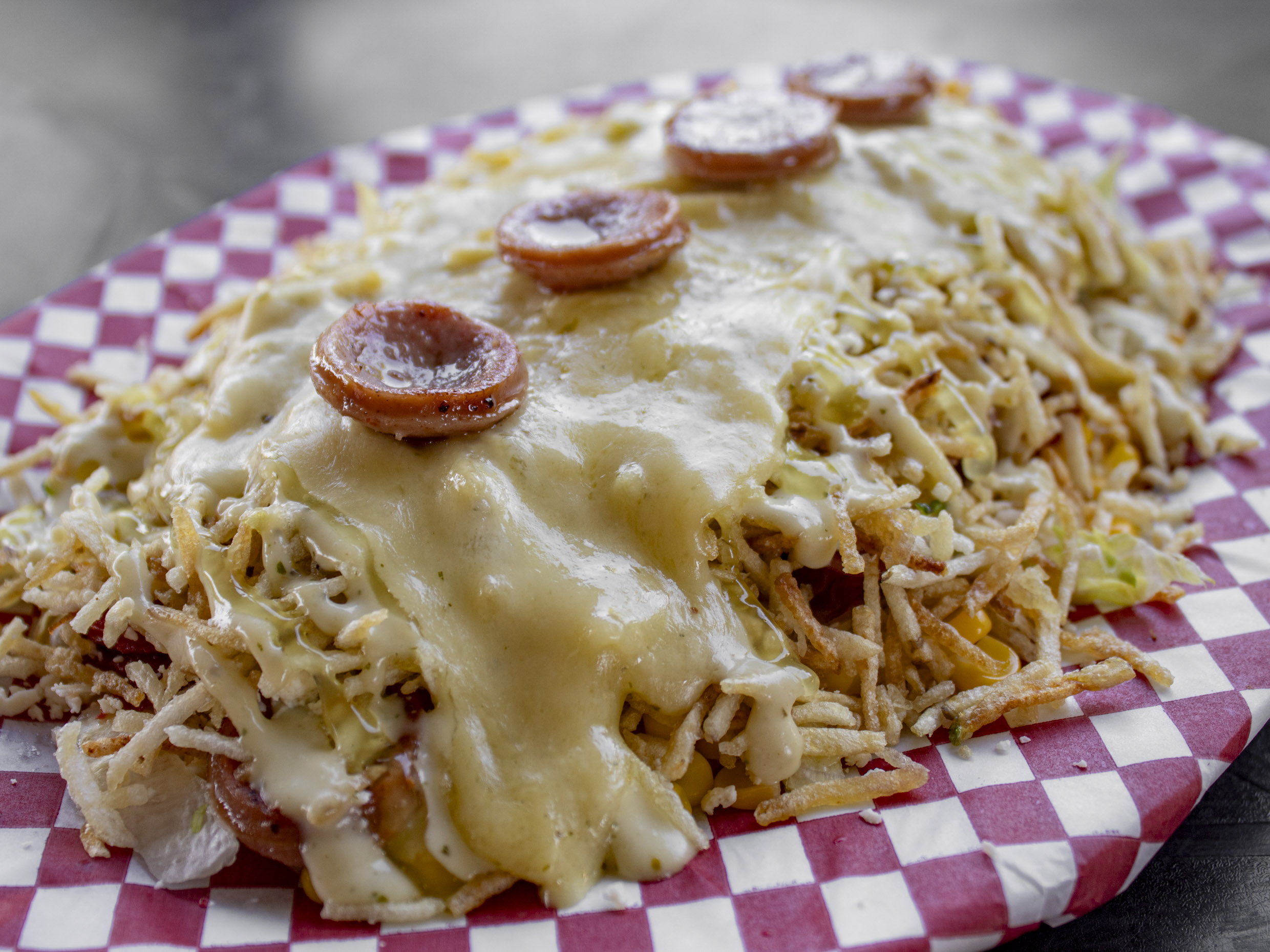 Maíz tierno, chorizo, butifarra, carne, pollo, mozarela, lechuga, papa chongo, queso costeño, salsa tartara y salsa piña