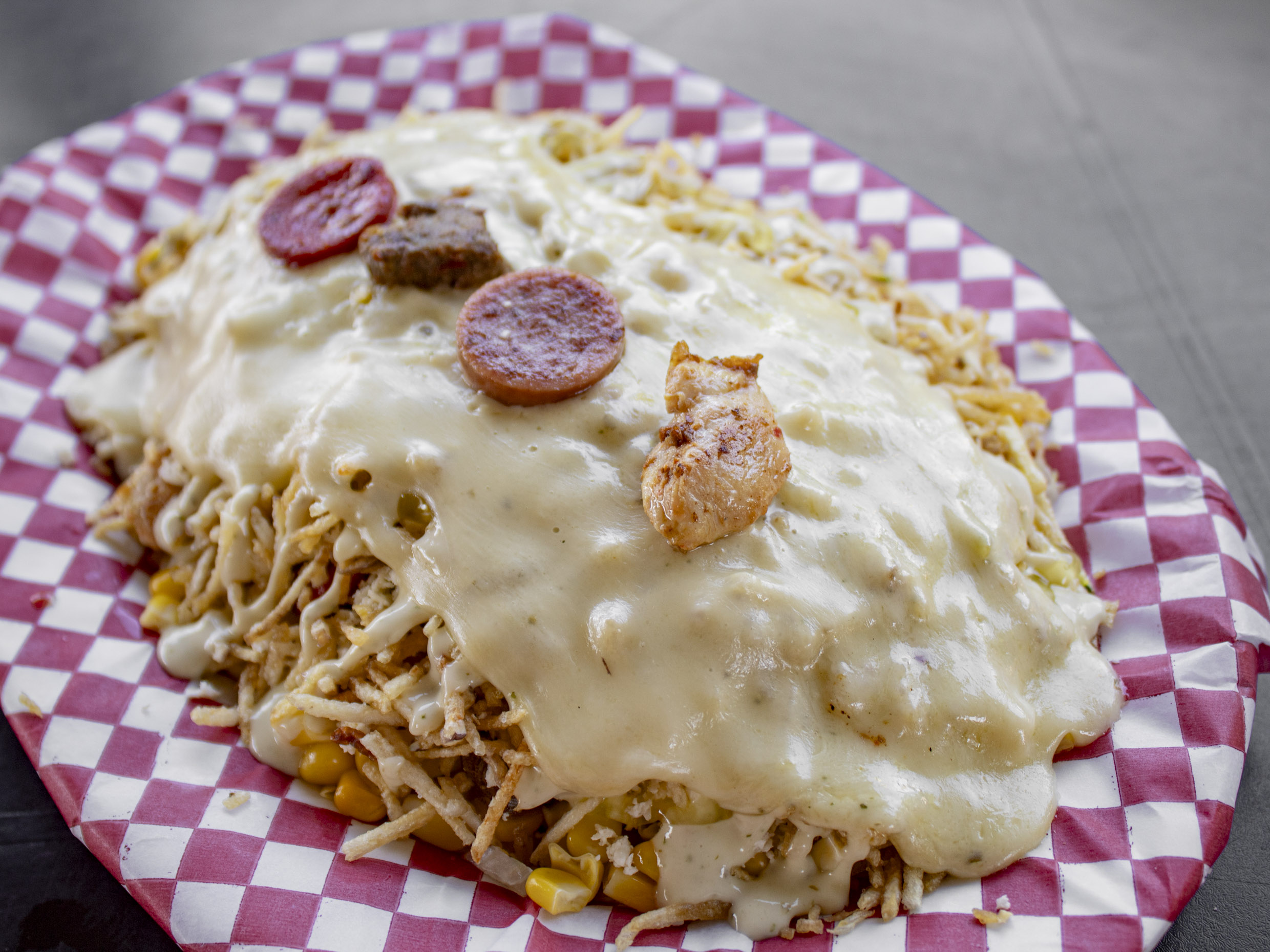 Maíz tierno, pollo, carne, chorizo, mozarela, lechuga, papa chongo, queso costeño, salsa tartara y salsa piña