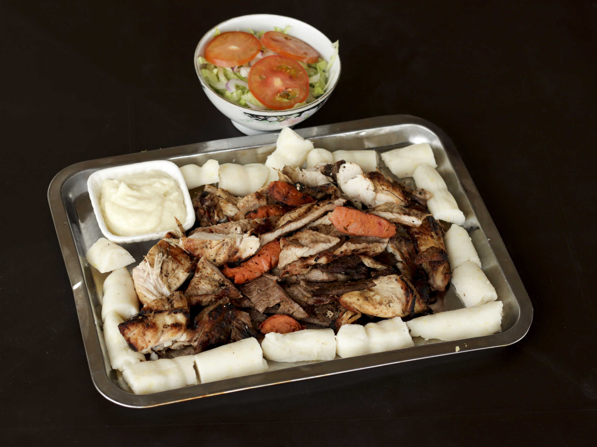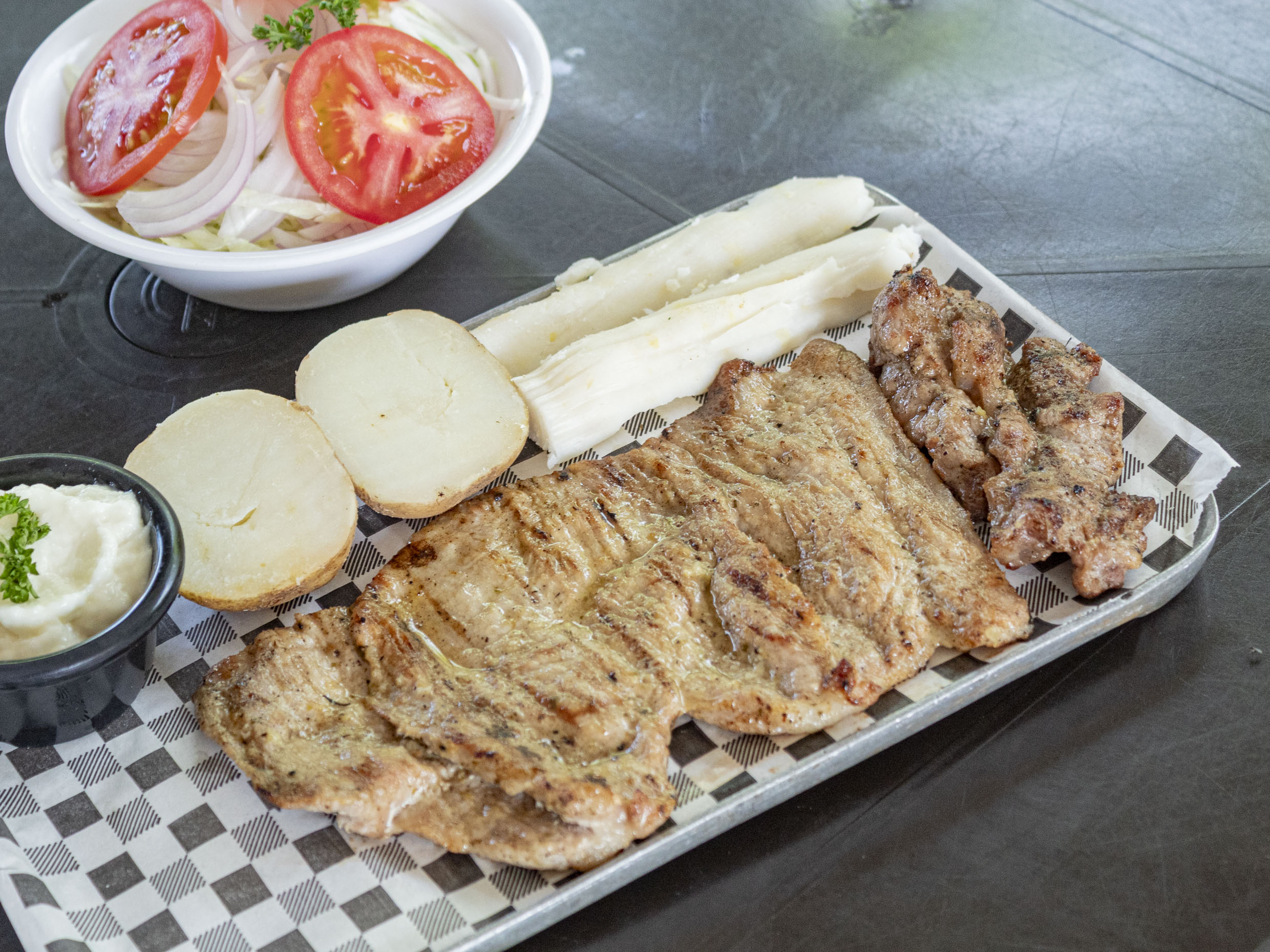 180 gr de carne, 180 gr de pulpa de cerdo, 1/4 de pollo, 90 gr de chorizo, acompañada de papa cocida, 3.5 onzas de salsa de ajo, ensalada de lechuga, cebolla y tomate
