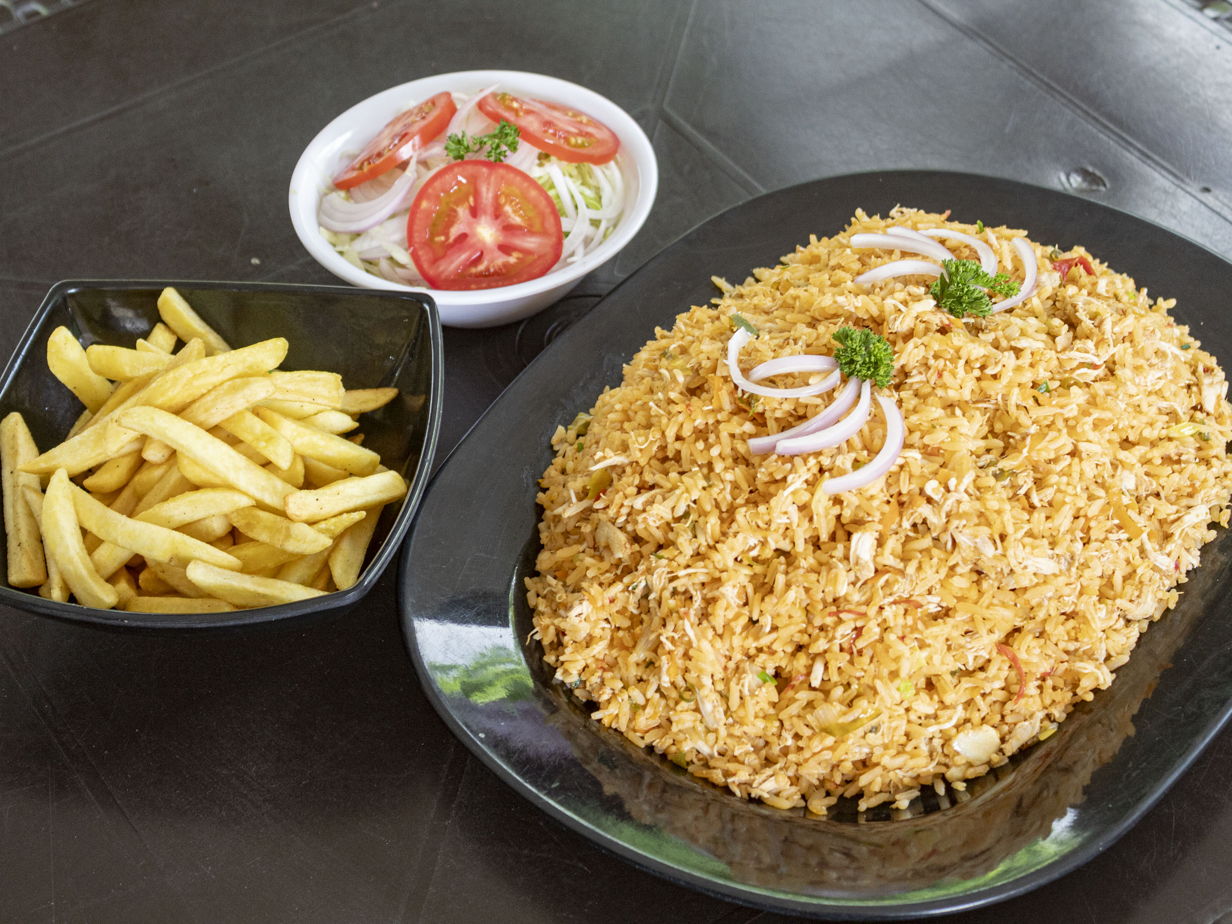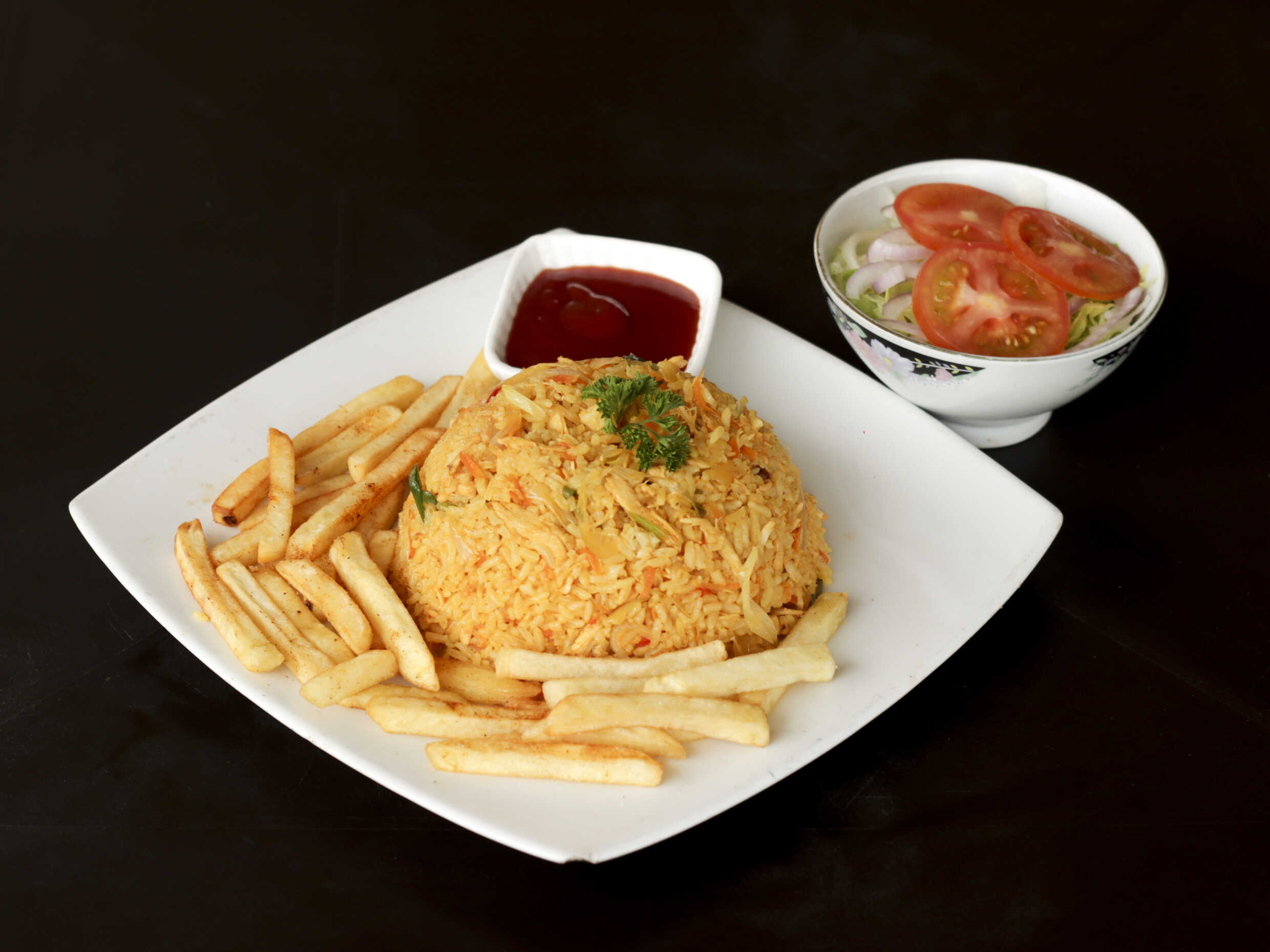 Porción de arroz para 3 a 4 personas, acompañado de 400 gr de papa francesa, ensalada de lechuga, cebolla y tomate