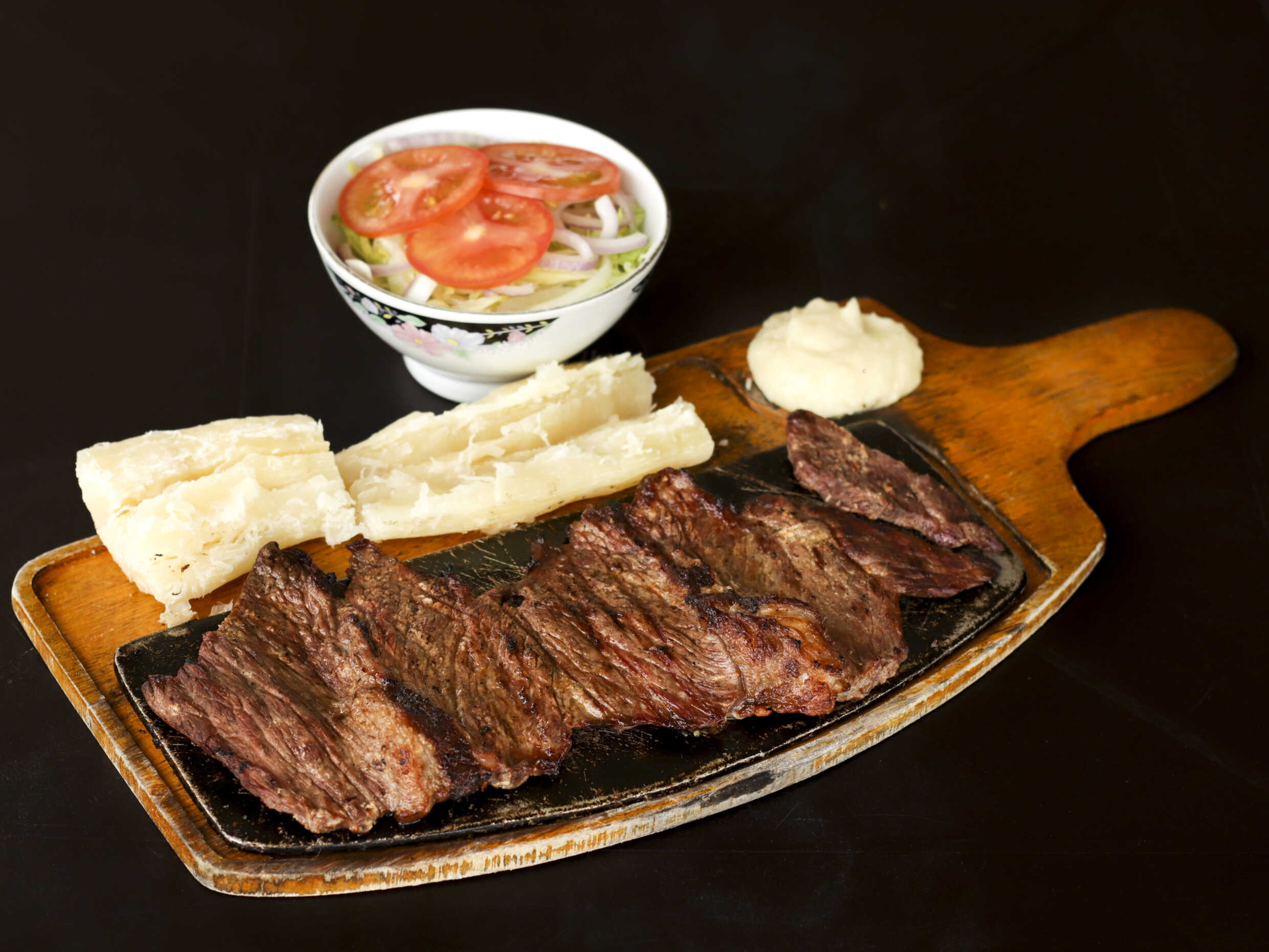 Punta gorda de 270 g, acompañada de yuca, salsa de ajo de una onza, ensalada de lechuga, cebolla y tomate.