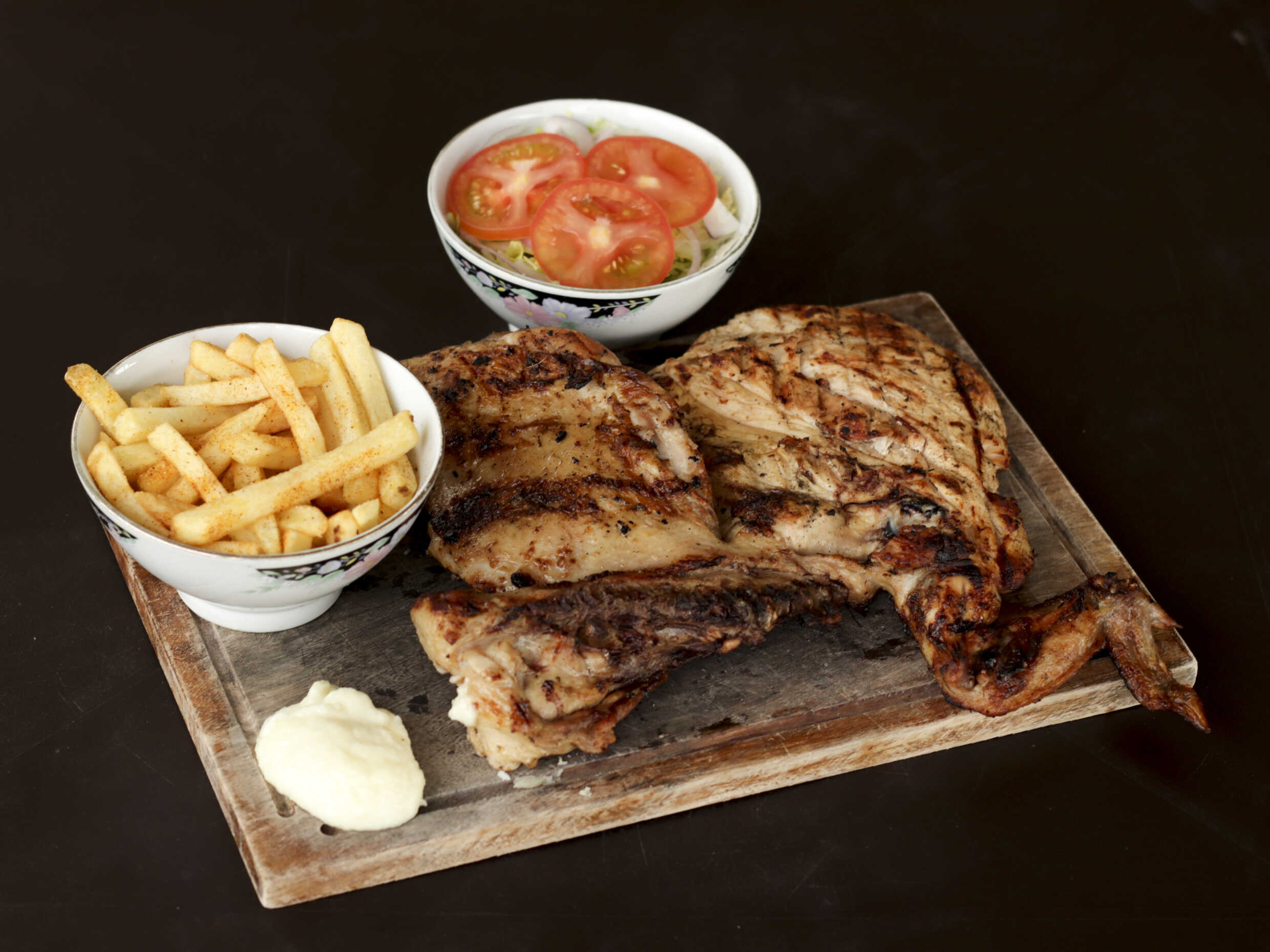 Medio pollo de 900 gr asado acompañado con papa francesa, salsa de ajo, ensalada de lechuga, cebolla y tomate.